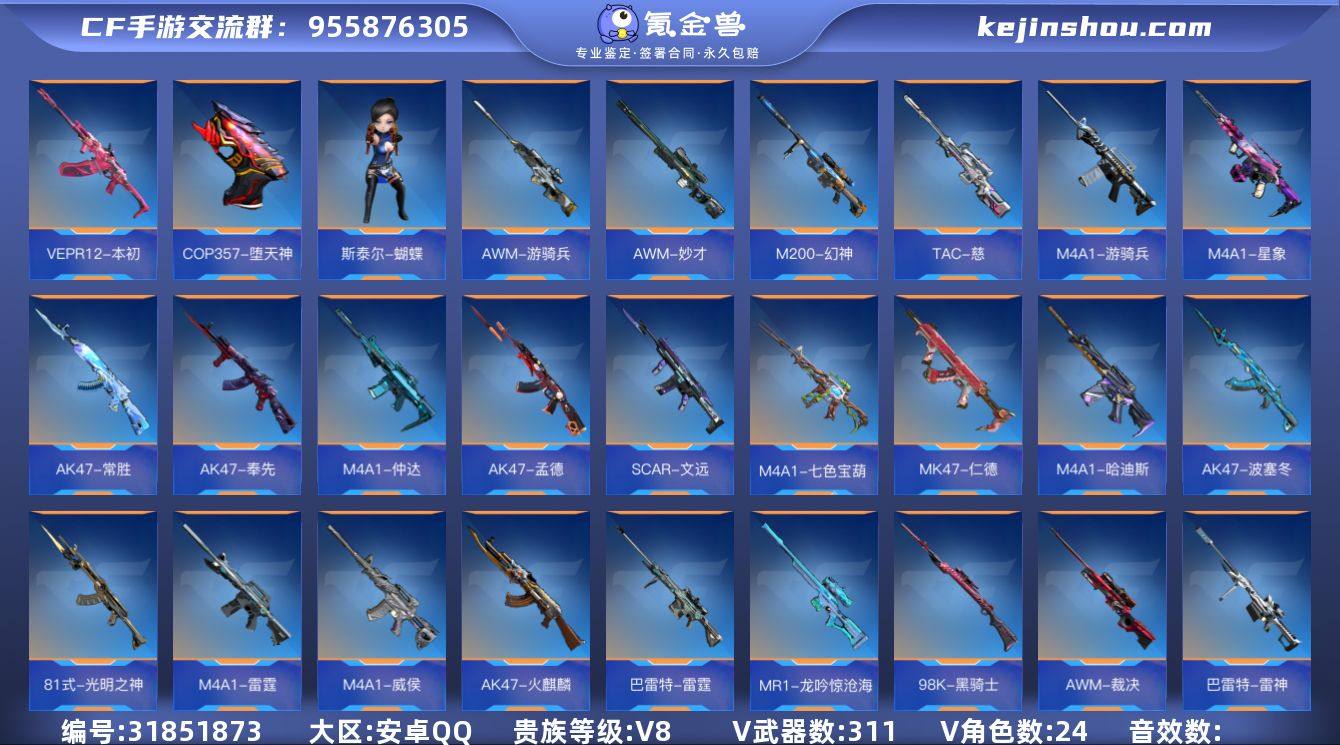 FC-JKHS5G 安卓QQ,成人号:是,角色等级:154,实名:有修改人脸机会/实名是本人,段位:枪圣,VIP等级:V8,V武器数量:311,V角色数量:24,V总数量:213,王者武器数:47,万化数量:629, 【人物角色】晴雅,孙悟空,牛妹,云悠悠,关小雨,海滩夜玫瑰,瞳,娜塔莎,樱,太阳神-曦,幽灵刀锋-觉醒,大老师,堕天使,周年庆纪念赛斯,复仇者,运动宝贝兰,洛伊,萝拉,夏日灵狐,暗影,春节兰,零,圣诞灵狐,刀锋-2017,魅惑灵狐,曼陀罗,幻影,夜玫瑰,潘多拉,猎狐者,斯沃特,秦师,祝融夫人,炽天使-X,武媚,杨玉凝,云悠悠-心动起点,蔡文昭,龙妹,蝉,木兰,奥妹,蜀雪,月神,妩媚妖姬,灵动武士,变装舞会兰,零-水下丽影,赛丝,麻雀,职场灵狐,职场灵狐-赛事经理,岚兮儿,斯薇特, 【王者武器】王者之誉,王者之兽,M12S-雷霆王者,王者之蝶,王者之武-燃竞之巅,王者之启,王者之势闪光弹,王者之势手雷,王者之心手雷,王者之影手雷,王者之兽手雷,王者之圣手雷,王者之心烟雾弹,王者之心闪光弹,王者之翼闪光弹,王者之兽闪光弹,王者之影闪光弹,王者之圣闪光弹,王者之兽烟雾弹,王者之影烟雾弹,王者之圣烟雾弹,王者之势烟雾弹,王者之翼烟雾弹,闪光弹-雷霆王者,烟雾弹-雷霆王者,高爆手雷-雷霆王者,王者之心,王者之影,王者之武,王者之势,王者之怒,王者之魂,王者之灵,王者之轮,王者之电,王者之锋,王者之啸,王者之刺,王者之击,王者之烈,王者之迹,王者之痕,王者之神,王者之狱,王者之腾,王者之仞,王者之隐, 【至尊套装】兽至尊,影至尊,势至尊,怒至尊,心至尊,狱至尊,神至尊,启至尊,腾至尊, 【带V枪械】王者之锋-HeartShot,AWM-游骑兵-紫魇,AWM-天龙-魔神,王者之痕-冰霜奇迹,王者之圣手雷-冰霜奇迹,加特林-炼狱-怒魔,王者之心闪光弹-HeartShot,王者之圣闪...