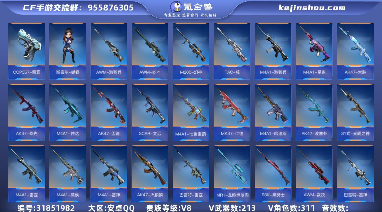 FC-JKHS5G 安卓QQ,成人号:是,角色等级:154,实名:有修改人脸机会/实名是本人,段位:枪圣,VIP等级:V8,V武器数量:311,V角色数量:24,V总数量:213,王者武器数:47,万化数量:629, 【人物角色】晴雅,孙悟空,牛妹,云悠悠,关小雨,海滩夜玫瑰,瞳,娜塔莎,樱,太阳神-曦,幽灵刀锋-觉醒,大老师,堕天使,周年庆纪念赛斯,复仇者,运动宝贝兰,洛伊,萝拉,夏日灵狐,暗影,春节兰,零,圣诞灵狐,刀锋-2017,魅惑灵狐,曼陀罗,幻影,夜玫瑰,潘多拉,猎狐者,斯沃特,秦师,祝融夫人,炽天使-X,武媚,杨玉凝,云悠悠-心动起点,蔡文昭,龙妹,蝉,木兰,奥妹,蜀雪,月神,妩媚妖姬,灵动武士,变装舞会兰,零-水下丽影,赛丝,麻雀,职场灵狐,职场灵狐-赛事经理,岚兮儿,斯薇特, 【王者武器】王者之誉,王者之兽,M12S-雷霆王者,王者之蝶,王者之武-燃竞之巅,王者之启,王者之势闪光弹,王者之势手雷,王者之心手雷,王者之影手雷,王者之兽手雷,王者之圣手雷,王者之心烟雾弹,王者之心闪光弹,王者之翼闪光弹,王者之兽闪光弹,王者之影闪光弹,王者之圣闪光弹,王者之兽烟雾弹,王者之影烟雾弹,王者之圣烟雾弹,王者之势烟雾弹,王者之翼烟雾弹,闪光弹-雷霆王者,烟雾弹-雷霆王者,高爆手雷-雷霆王者,王者之心,王者之影,王者之武,王者之势,王者之怒,王者之魂,王者之灵,王者之轮,王者之电,王者之锋,王者之啸,王者之刺,王者之击,王者之烈,王者之迹,王者之痕,王者之神,王者之狱,王者之腾,王者之仞,王者之隐, 【至尊套装】兽至尊,影至尊,势至尊,怒至尊,心至尊,狱至尊,神至尊,启至尊,腾至尊, 【带V枪械】王者之锋-HeartShot,AWM-游骑兵-紫魇,AWM-天龙-魔神,王者之痕-冰霜奇迹,王者之圣手雷-冰霜奇迹,加特林-炼狱-怒魔,王者之心闪光弹-HeartShot,王者之圣闪...