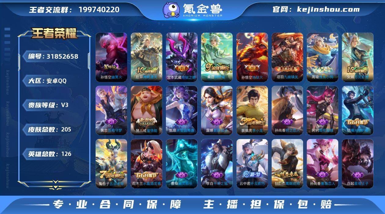安卓Q-V3-最强王者段位-发育19段-打野15段-1星元-126英雄-205皮肤-4传说-39史诗 【传说皮肤】:后羿神树通天,桑启鸣野蒿,宫本武藏地狱之眼,孙悟空地狱火 【限定皮肤】:姜子牙天穹之誓,狄仁杰阴阳师,孙尚香蔷薇恋人,庄周高山流水,钟无艳王者之锤,夏侯惇朔风刀,狄仁杰万华元夜,达摩沙漠行僧,老夫子醍醐杖,程咬金演武夺筹,兰陵王金庭之子,李元芳云中旅人,钟馗驱傩正仪,干将莫邪胡桃夹子,鬼谷子原初探秘者,鬼谷子五谷丰年,苏烈千军破阵,弈星混沌棋,梦奇顽趣,沈梦溪大漠名商,明世隐疑决卦,裴擒虎李小龙,裴擒虎擒涛扼浪,云中君纤云弄巧,盾山御銮,猪八戒猪悟能,鲁班大师探海日志,桑启海盐诗旅,艾琳女武神,阿古朵江河有灵,张良古海寻踪,鬼谷子天穹祈灯,沈梦溪龙舞盛年,刘邦剑破天穹,程咬金群星魔术团,周瑜熔金海岸 【赛季限定】:盾山御銮,夏侯惇朔风刀,弈星混沌棋,明世隐疑决卦,老夫子醍醐杖,鬼谷子原初探秘者,狄仁杰万华元夜,程咬金演武夺筹,钟馗驱傩正仪,苏烈千军破阵,达摩沙漠行僧,兰陵王金庭之子,沈梦溪大漠名商,李元芳云中旅人,桑启海盐诗旅,裴擒虎擒涛扼浪,鲁班大师探海日志,张良古海寻踪,鬼谷子天穹祈灯,刘邦剑破天穹,姜子牙天穹之誓,东皇太一噬灭天穹,太乙真人谧流熔炉,钟馗虚灵犬护,甄姬逆浪荇歌,亚瑟荣光之誓,梦奇顽趣,牛魔星界战将,项羽九幽镇关 【战令限定】:周瑜线条小狗 【史诗皮肤】:周瑜线条小狗,项羽九幽镇关,女娲万灵启世,黄忠百相守梦,牛魔星界战将,阿古朵江河有灵,梦奇顽趣,鬼谷子五谷丰年,庄周高山流水,猪八戒猪悟能,云中君纤云弄巧,裴擒虎李小龙,孙尚香时之恋人,狄仁杰鹰眼统帅,孙策猫狗日记,阿轲节奏热浪,白起星夜王子,程咬金功夫厨神,蔡文姬舞动绿茵,铠曙光守护者,百里守约特工魅影,雅典娜冰冠公主...