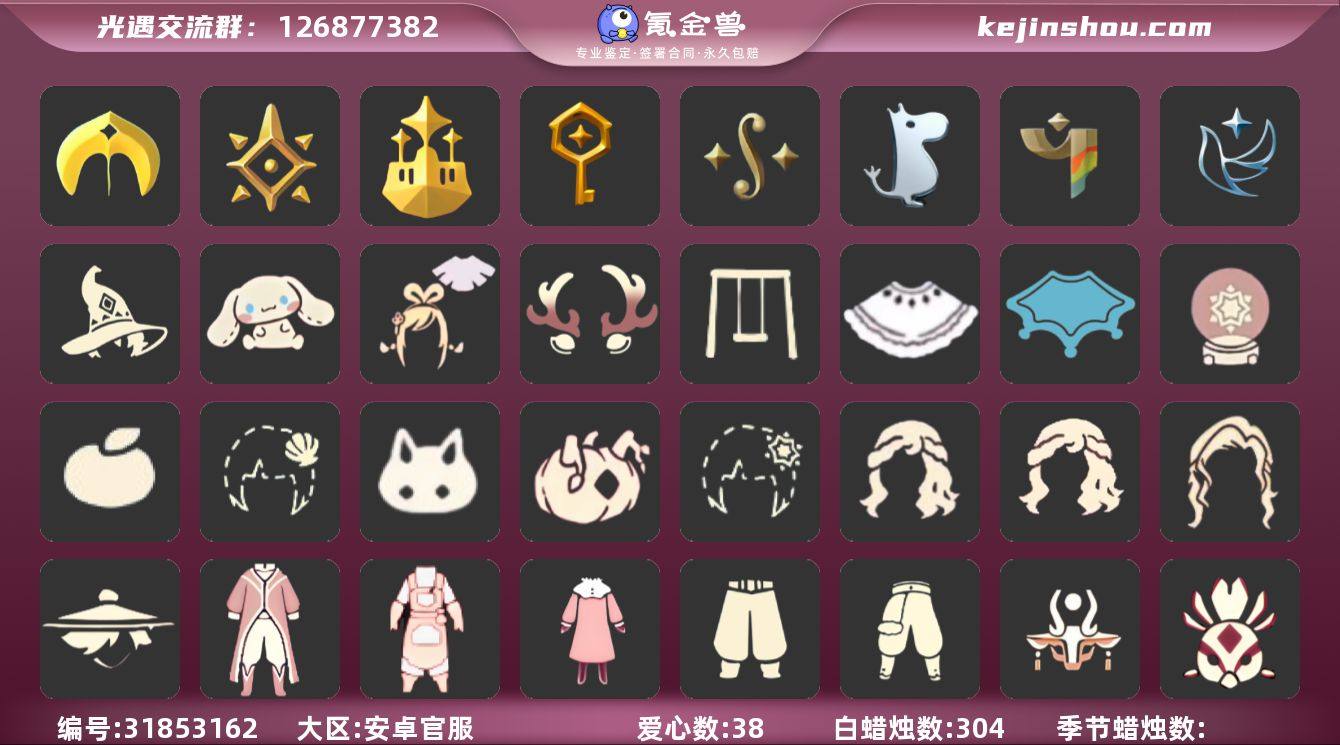 iOS官服 手机账号 1珍稀物品 9毕业季 6毕业图 427蜡烛 【珍稀物品】彩虹围巾(五塑彩带斗) 【季节已毕业】青鸟季,追忆季,夜行季,归巢季,九色鹿(九色鹿季),筑巢季,二重奏季,姆明季,彩染季 【完成地图】晨岛,云野,雨林,霞谷,墓土(暮土),禁阁 【礼包】线框斗篷礼包(周年线框斗篷),牛仔裤(阔腿牛仔),姆明饰品套装(姆明尾巴),彩虹帽(多彩绒帽),巫师(巫师帽),绊爱(绊爱斗篷)(绊爱礼包),心心相印发饰礼包,四叶草(四叶草头饰),星月头饰(星月头冠),九色鹿角(神鹿祝福头饰)(神鹿祝福礼包),彩虹耳机,鹿角(圣诞鹿角),围巾(小王子斗篷)(小王子围巾),星球斗(星球夹克),欧若拉之翼,蝙蝠套(蝙蝠斗篷)(南瓜头),蜘蛛斗(蛛丝斗篷)(蛛网斗篷),瑞雪(瑞雪斗篷)(暖冬瑞雪),白绒金(白雪斗篷),红伞(瑞气纸伞),小狐狸(狐狸背包),猫背饰(猫咪背饰) 【裤子】筑巢季·裤子(设计师长袍),妮妮裙子(妮妮长裙),武士裤,背带裤,搓澡巾,击剑裤 【面具】夜行毕业面具(棕熊面具),辉光羚羊面具 【面饰】黑框眼镜(粗框眼镜),青鸟毕业面饰(青鸟面饰),红耳机 【项链】围巾(肩带) 【发型】飞天盘发(九色鹿丸子头),虚荣,归巢毕业发型(五塑彩羽发),若笠(箬笠) 【头饰】平顶帽,蓝色音乐会(蓝色音乐符) 【斗篷】粉红绒毛斗篷(绒毛斗篷),瑞雪斗篷,青鸟毕业斗篷(青鸟斗篷),彩染围巾斗篷,绿芽,海洋斗 【配饰】鲲灯(追忆之书),相机(季卡相机),小红伞(姆明红伞)(姆明大伞),姆明抱枕,雨伞,筑巢季·小手办(光之子试衣),高音钢琴(白色高脚钢琴)
