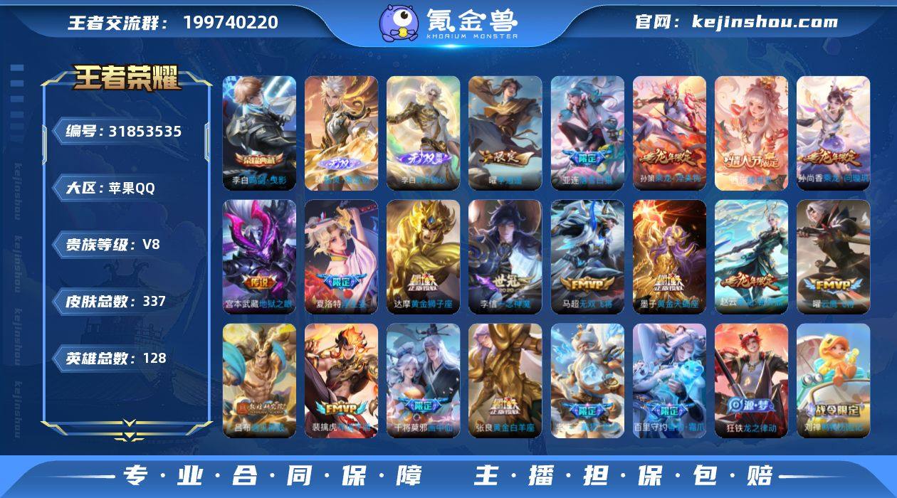 1珍品传说 31传说 128英雄 337皮肤 可修改实名 金标曜 【英雄全皮】马超全皮,司空震全皮,敖隐全皮,孙权全皮,夏洛特全皮,影全皮,大禹全皮 【稀有英雄】敖隐(小龙人),大司命,嬴政(始皇帝),韩信(韩跳跳),夏洛特(夏师傅),艾琳,橘右京(橘子),娜可露露(鸟人),不知火舞,赵云,金蝉(唐僧),戈娅 【荣耀水晶】鸣剑·曳影,九霄神辉(木兰典藏) 【无双皮】器灵·螭龙剑,碎月剑心(李白无双) 【珍品传说】时之奇旅-孙策 【传说皮】神骥·逐星野,黄金天蝎座,落雪白狼,乘龙·淬吴钩(孙策年限),乘龙·铭钟鼎(赵云年限),琥珀纪元马超,乘龙·问璇玑(孙尚香年限),祥瑞亨通,神树通天,续相思,李逍遥,黄金狮子座,黄金白羊座,地狱之眼,一念神魔,云鹰飞将(小将军),无双飞将,时之恋人-刘备(电焊工),画中仙,浮生妄,遇见神鼓 【珍宝阁皮】妄想食味,万物之道 【赛季/战令皮】噬灭天穹(s37),古海寻踪(s33),海盐诗旅(s30),擒涛扼浪(s31),潮玩骑兵,奇幻香踪,探海日志(s32),驭风魔法,玲珑珍味,流音漫舞,地狱燃心,剑破天穹(s35),天穹祈灯(s34),青焰无极,苍威无极,天穹之誓(s36),暗影游猎(游乐娃子),狂想玩偶喵,金庭之子(s27),电玩高手(电玩铁子),大漠名商(s28),云中旅人(s29) 【史诗皮】破空之剑,星界战将,百相守梦-百里守约,茶境仙,战舞者,蒙犽顽岩魄,琥珀纪元伽罗,超元猎域,蔬乡物语(鲁班七号),怒海争锋,化蝶舞,线条小狗-周瑜,九幽镇关,巫礼祀神,万灵启世,鸭鸭历险记-刘禅,雪豹·霜爪,藏狐·褐绒,百相守梦-黄忠,龙之律动,紫霞仙子,黄金分割率,特工魅影,千年之狐,永昼,蒙恬荣光圣徽,高渐离燃音魔法,百解令(蒙犽),雪夜绮愿(周瑜),江河有灵,匿光侦查者,鹤归松栖(赵怀真),偶像歌手,龙骑士(小龙虾),魅语,白蛇,电玩·爆裂旋风,猫狗日记-孙策,时之恋人-孙尚香,乱世虎臣,修罗,摇滚巨星,水果甜心,绅士熊喵,天才门将,星夜王子,心灵骇客,德古拉伯爵,暗隐猎兽者,幽灵船长,...