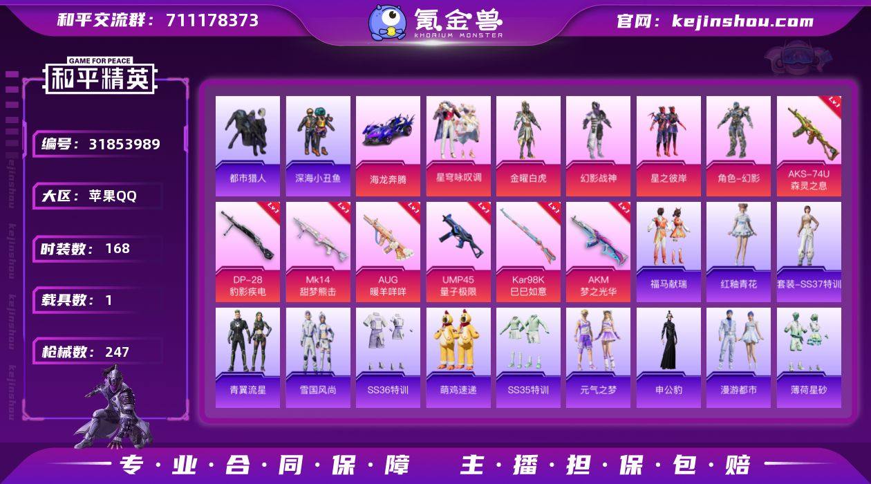安卓 手Q-8粉装-14特效枪-3载具-13粉色飞行器-91797热力值-14王牌印记-184套装-275枪皮 【热门品类】:套装-派对舞王,套装-深海小丑鱼,套装-小丑鱼,套装-龟仙人,角色-Mark.06 【粉色套装】:粉装-第五大道,粉装-未来歌姬,粉装-金丰海韵,角色-狂花道·不知火舞,角色-萨利娅,粉装-雪月幻音,角色-绯穹魔姬,角色-异瞳寒姬 【粉色枪皮等级】:AKM-甜心宝贝(七级),SCAR-L-锦绣绵绵(五级),M416-电玩时刻(五级),M416-灵猫魔法师(三级),GROZA-精灵之光(三级),AUG-暖羊咩咩(五级),ACE32-萌骑漫游(三级),AKS-74U-信仰神谕(七级),Kar98K-巳巳如意(五级),Mk14-福马献瑞(五级),MK12-雪月幻音(一级),DP-28-千金淑猫(三级),DP-28-豹影疾电(五级),爆炸猎弓-拳皇·狂花道(七级) 【粉色载具】:疾风龙骑,星梦玉骢,护世瑞兽 【粉色枪皮】:AKM-甜心宝贝,SCAR-L-锦绣绵绵,M416-电玩时刻,M416-灵猫魔法师,GROZA-精灵之光,AUG-暖羊咩咩,ACE32-萌骑漫游,AKS-74U-信仰神谕,Kar98K-巳巳如意,Mk14-福马献瑞,MK12-雪月幻音,DP-28-千金淑猫,DP-28-豹影疾电,爆炸猎弓-拳皇·狂花道 【粉色飞行器】:炫彩糖果飞行器,梦幻火箭飞行器,镜域双华-灵镜之阶,绝色倾城飞行器,龙翔九天飞行器,曦光华影飞行器,幽焰列车飞行器,凤舞九天飞行器,万象金身飞行器,灵猫魔法师飞行器,飞天猪飞行器,灵珠游龙飞行器,极意拳锋飞行器 【粉色降落伞】:绝对恒星降落伞,甜心宝贝降落伞,星之彼岸降落伞,环太平洋降落伞,第五大道降落伞,蜜语绒猫降落伞,镜域双华降落伞,江南烟雨降落伞,电糖天使降落伞,精灵梦叶罗丽降落伞,墨龙九天降落伞,星梦奇缘降落伞,金丰海韵降落伞,拳皇·狂花道降落伞,未来领航者降落伞,精灵之光降落伞,幽焰骑士降落伞,千金淑猫降落伞,临安公主降落伞,信仰神谕降落伞,金蛇镇世降...