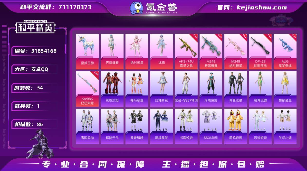 【mhp1075】苹果 手Q-无敌战神框-2神装-18粉装-9特效枪-3载具-6粉色飞行器-100953热力值-16王牌印记-180套装-240枪皮 【红色神装等级】:辉羽雀灵-初翊(五级),镜域双华-欧若拉(一级) 【红色角色神装】:辉羽雀灵-初翊,镜域双华-欧若拉 【热门品类】:粉装-梦幻火箭,粉装-缤纷油彩,套装-浪漫天命,套装-动感兔斯基人偶服,套装-龟仙人,套装-潮萌小黄鸭,套装-浪漫波比 【粉色载具】:玛莎拉蒂Ghibli(粉),萌喵橘座,空客H135-蔚蓝之翼,星梦玉骢 【粉色套装】:粉装-宝贝奶油派,粉装-梦幻火箭,粉装-缤纷油彩,粉装-炙焰红王,粉装-馨动时刻,粉装-山涧鹿灵,角色-洛天依,粉装-黑伞漫漫,粉装-青葱仙萝,粉装-暗星紫秘,粉装-天之羽翼,粉装-第五大道,角色-严莉莉,角色-小蓝,角色-美琪,角色-智耀战神,角色-绯穹魔姬,角色-花灵 【粉色枪皮等级】:SCAR-L-童趣迷兔(七级),M416-心之恋语(七级),M416-风花雪月(一级),Vector-最终圣卫者(二级),Kar98K-巳巳如意(五级),Kar98K-圣域龙灵(三级),M24-镜域双华(三级),DP-28-豹影疾电(五级),平底锅-喜羊羊与灰太狼(二级) 【粉色枪皮】:SCAR-L-童趣迷兔,M416-心之恋语,M416-风花雪月,Vector-最终圣卫者,Kar98K-巳巳如意,Kar98K-圣域龙灵,M24-镜域双华,DP-28-豹影疾电,平底锅-喜羊羊与灰太狼 【粉色飞行器】:红伞翩翩飞行器,镜域双华-灵镜之阶,曦光华影飞行器,圣域金龙飞行器,绯果甜心飞行器 【粉色降落伞】:梦幻火箭降落伞,童趣迷兔降落伞,葫芦兄弟降落伞,暗夜玫瑰降落伞,洛神天依降落伞,红伞翩翩降落伞,蓝莓炮弹降落伞,碧影闪光降落伞,彩虹甜喵降落伞,暗夜鎏金降落伞,未来歌姬降落伞,莲影清波降落伞,圣堂之誓降落伞,镜域双华降落伞,巴啦啦小魔仙降落伞,星梦奇缘降落伞,千金淑猫降落伞,樱桃泡泡降落伞,圣域龙灵降落伞...