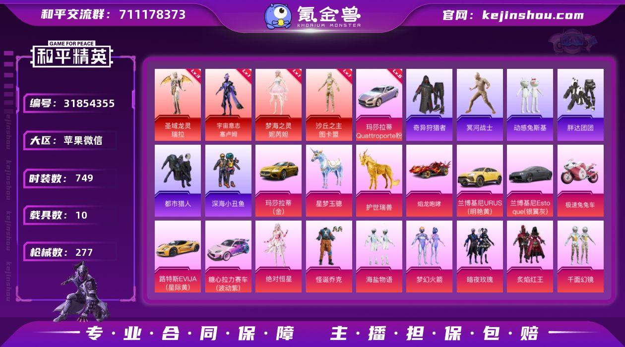 实名:不可二次实名 是否支持人脸包赔:支持 粉装数量:28 特效枪数量:26 载具数:10 时装数:749 枪械数:277 冥河战士,奇异狩猎者,动感兔斯基,都市猎人,胖达团团,深海小丑鱼 三级圣域龙灵-瑞拉,一级梦海之灵-妮芮妲,一级沙丘之主-图卡盟,一级宇宙意志-塞卢姆 六级玛莎拉蒂Quattroporte(幻星粉) 绝对恒星,暗夜玫瑰,宝贝奶油派,缤纷油彩,薄荷物语,冰霜白皇,垂柳戏鸭,创世·救赎,炙焰红王,蝶舞迷情,粉色回忆,怪诞乔克,盖世英雄,海渊国主,海盐物语,零号机款机体服,蓝莓炮弹,梦幻火箭,千面幻镜,俏雪含霜,沙场疾风,天使彩虹糖,童趣迷兔,甜心巧克力,雪国幻梦,绚金瑰梦,星之彼岸,吟月归客 九级M416-至情至圣,七级破片手榴弹-秋玉花灯,六级SCAR-L-童趣迷兔,五级AUG-妙趣可丽,五级Groza-香水柠檬,五级Kar98K-巳巳如意,五级烟雾弹-猫咪绅士,四级AKS-74U-森灵之息,四级AKM-梦之光华,四级Mini14-绚金瑰梦,四级UMP45-玉魂晶魄,三级GROZA-精灵之光,三级P90-沙丘之主,三级S12K-海渊国主,三级SCAR-L金蛇镇世,二级M249-蓝莓炮弹,二级UMP45-宇宙意志,一级M249-绝对恒星,一级Kar98K-圣域龙灵,一级M16A4-垂柳戏鸭,一级M200-梦海之灵,一级M416-风花雪月,一级M416-暖熊萌萌,一级M416-心之恋语,一级SCAR-L-梦幻火箭,一级UMP45-恐龙拽拽 玛莎拉蒂Ghibli(金),护世瑞兽,极速兔兔车,兰博基尼Estoque(银翼灰),兰博基尼URUS(明艳黄),路特斯EVIJA(星际黄),糖心拉力赛车(波动紫),星梦玉骢,焰龙咆哮 狙击之神,马上有钱,福马献瑞,红釉青花,SS37特训,雨过天青,雪国风尚,画境星梦,琴音绮想,书海巡游,SS36特训,冥河战士,奇异狩猎者,SS35特训,超感刻度,甜心蒙太奇,暗影哥特,暗夜傀儡,暗夜魅影,爱崽白熊,冰川特警,冰冻风暴,缤纷果语,缤纷假日,缤纷焰火,滨海假日,冰河战士,爆裂葡萄,冰爽风暴,冰爽海盐,贝斯之夜,醇脆可可,春光漫游,雏菊兔兔,长空猛禽,春野茶蘼,纯真浪花,动感兔斯基,蝶变,多纳泰罗,都市猎人,淡雅花蕊,飞驰魅影,风玲,粉红小猪,粉团憨憨,福星高照,飞行日记,贵族骑装,幻彩翩翩,海岛探路者,鹤鸣,虎虎生威吉莉,海龙战士,荷畔雨呱,灰色格斗者,红色运动,幻世战舞者,金戈铁马,惊鸿侠骨,娇憨猪猪,竞技名士,激萌罗小黑,坚韧舞者,军械专家,锦衣飞扬,金耀舞者,空岛之星,快乐星愿,快闪甜心,狂沙舞者,空投萌叽,蓝冰羽,蓝调潮人,龙的传人,绿翡凌光,龙魂突击队,零款战斗服,玲珑飞花,萝兰蝴蝶,浪漫假日,猎梦纪元,浪漫天命,浪漫樱花,莱茵河畔,恋语绒绒,漫步者,棉花软糖,萌黄之夏,米开朗基罗,麻辣教官,懵萌河马,曼妙人鱼,萌趣咩咩,萌趣颜团子,明日香款战斗服,明鸳圣池,弄潮海豚,霓虹极客,怒火燎原,牛气冲天,浓情蜜辣,牛气满满,暖心熊熊,胖达团团,破蛋小黄鸡,轻风白浪,沁蓝冰爽,绮丽涂鸦,俏皮奶喵,青涩时光,青团波波,清新柠檬,青玉碎影,瑞龙福将,荣耀,热情海星,沙暴袭击者,深海小丑鱼,神气柴柴,SS17特训,SS18特训,SS19特训,SS20特训,SS21特训,SS22特训,SS24特训,SS25特训,SS26特训,SS27特训,SS28特训,SS29特训,SS30特训套装,SS31特训套装,SS32特训套装,SS33特训套装,石蕴玉辉,探宝勇士,甜蜜告白,甜梦熊熊,涂山之恋,糖糖葫芦,甜心亚梦,