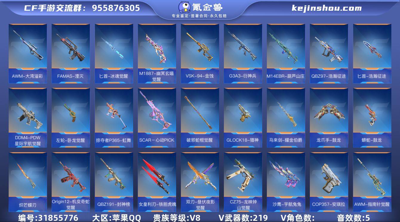 B652731 【极品v8-27王者-冰皮M4雷霆王者-冰皮王力-火皮王怒-王者大炮-火皮王神-无双奉先套-幻神套-孟德-仲达-慈-寒霜游骑兵】 王者V武器数量22 英雄武器数量219 音效卡数量5 万化数量369 VIP等级【文本】VIP8级 【专家】 【支持】 【是】 【可排位】 音效卡5 狙击枪线3 消灭音效3 语音卡2 抛物线5 音效卡:M200-幻神-现代战场,AK47-无影-电音,巴雷特-毁灭-现代战场,MK47-鼓龙-嘴炮,98K-星神-电音; 狙击枪线:狙击枪线-诸神黄昏,狙击枪线-遁天梭,AWM-裁决-流光之线; 消灭音效:消灭音效-赏金猎人,消灭音效-能量核心,消灭音效-斩杀; 语音卡:晴雅语音卡,葫芦娃语音卡; 抛物线:抛物线-能量核心,抛物线-绿,抛物线-蓝,抛物线-黄,抛物线-粉;