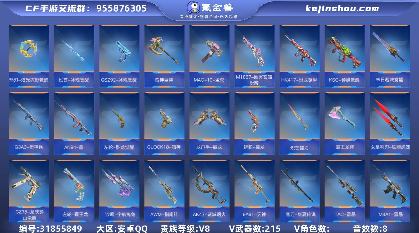 B652752 【极品v8-二至尊15王者-星象-奉先-烽火仲达套-幻神套-元让套-过载孟德-常胜-妙才-盖】 王者V武器数量14 英雄武器数量215 音效卡数量8 万化数量365 VIP等级【文本】VIP8级 【新锐】 【支持】 【是】 【可排位】 音效卡8 狙击枪线3 消灭音效5 语音卡1 抛物线6 音效卡:M200-幻神-现代战场,AK47-无影-电音,巴雷特-毁灭-现代战场,M4A1-仲达-现代战场,MK47-鼓龙-嘴炮,M4A1-雷神-电音,AK47-无影-现代战场,AK47-火麒麟-电音; 狙击枪线:狙击枪线-诸神黄昏,狙击枪线-HeartShot,狙击枪线-遁天梭; 消灭音效:消灭音效-赏金猎人,消灭音效-诸神黄昏,消灭音效-能量核心,消灭音效-焰火贺岁,消灭音效-斩杀; 语音卡:岚兮儿语音卡; 抛物线:抛物线-HeartShot,抛物线-绿,抛物线-蓝,抛物线-黄,抛物线-粉,抛物线-诸神黄昏;