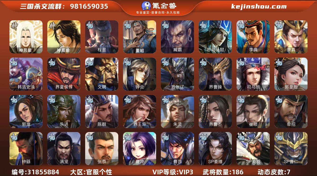 6史诗双神中军,玉龙吴王六剑界孙权,诸葛瞻,关索,花鬘,贺齐,左慈,程昱6史诗,天工势黄祖,神周瑜,神吕蒙,真动界夏侯惇,sp赵云,带皮崔琰,界吕布,孙茹,界刘表,彭恙,界朱治,诸葛恪,界张嶷,牵招,sp曹仁,界于吉,张翼,张恭,金皮界王异,刘巴,界马超,孙邵,张温,濮阳兴,荀谌186将,国战63将,满级活树