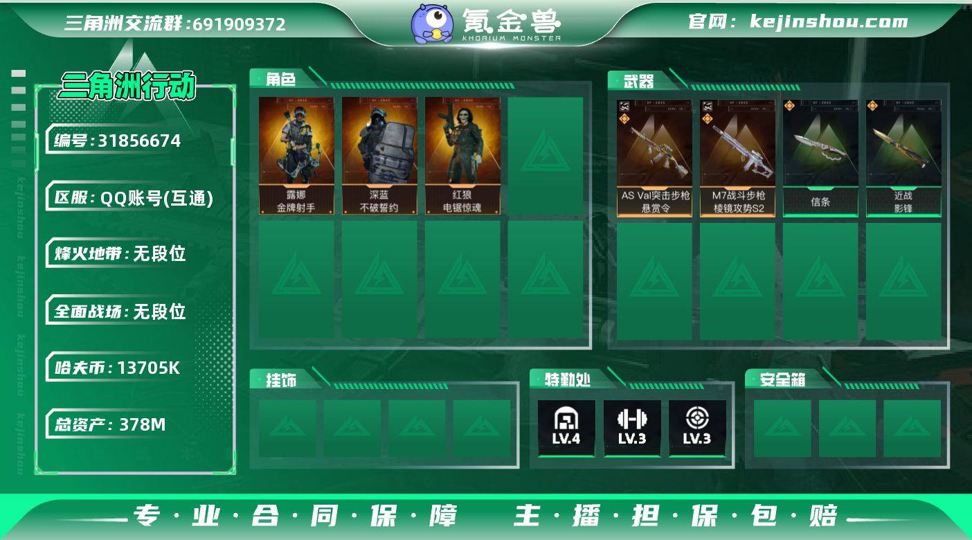 LJ4718总资产378.1M哈弗币13705K近战武器-影锋,近战武器-信条露娜金牌射手,红狼电锯惊魂,深蓝不破誓约ASVal突击步枪-悬赏令(优品B),M7战斗步枪-棱镜攻势S2(优品C)无AW子弹43发三角币2仓库LV.9基础安全箱靶场LV.6训练中心LV.6无,露娜-金牌射手,红狼-电锯惊魂,深蓝-不破誓约,近战-影锋,近战-信条,AS Val突击步枪-悬赏令,M7战斗步枪-棱镜攻势S2