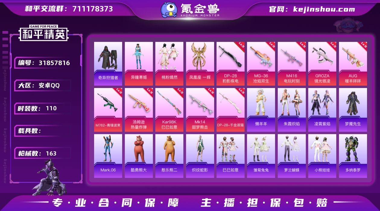 安卓 手Q-3粉装-11特效枪-0载具-3粉色飞行器-48951热力值-3王牌印记-110套装-163枪皮 【热门品类】:套装-奇异狩猎者,角色-Mark.06 【粉色套装】:粉装-桃粉嫣然,角色-凤凰座 一辉,角色-异瞳寒姬 【粉色枪皮等级】:M416-电玩时刻(五级),GROZA-镜光银凌(五级),AUG-暖羊咩咩(五级),M762-青锋波束(五级),汤姆逊-热量炸弹(五级),Kar98K-巳巳如意(五级),Mk14-甜梦熊击(五级),Mk14-福马献瑞(一级),DP-28-千金淑猫(五级),DP-28-豹影疾电(五级),MG-36-沧焰双生(五级) 【粉色枪皮】:M416-电玩时刻,GROZA-镜光银凌,AUG-暖羊咩咩,M762-青锋波束,汤姆逊-热量炸弹,Kar98K-巳巳如意,Mk14-甜梦熊击,Mk14-福马献瑞,DP-28-千金淑猫,DP-28-豹影疾电,MG-36-沧焰双生 【粉色飞行器】:炫彩糖果飞行器,彩虹独角兽飞行器 【粉色降落伞】:星之彼岸降落伞,洛神天依降落伞,临安公主降落伞,信仰神谕降落伞,鬼刀降落伞,幻影飞狐降落伞,智耀战神降落伞,圣斗士星矢降落伞,星穹咏叹调降落伞,幻彩电音降落伞,绯穹魔姬降落伞,炫彩糖果降落伞 【稀有套装】:玩偶服-酷勇熊大,玩偶服-憨乐熊二,套装-炽纹蛇影,套装-巳巳如意,套装-炫彩糖果,套装-雏菊兔兔,套装-萝兰蝴蝶,套装-小熊娃娃,角色-多纳泰罗,角色-狂花道·雅典娜,套装-糖糖葫芦,套装-青团波波,套装-棉花软糖,角色-许七安,角色-临安公主,角色-怀庆长公主,套装-燕燕于飞,套装-鱼渊荷华,角色-风玲,角色-青瓷战姬,套装-紫幽梦,套装-蓝冰羽,角色-猎影月神,套装-星渊小夜曲,套装-云朵鹅,套装-雪绒豹,套装-蜜露汐语,套装-朱霞炽焰,套装-凌霄紫焰,玩偶服-懒羊羊 【稀有枪皮】:AKM-彩虹符号,AKM-灼热熔岩,AKM-生命誓言,AKM-破晓战魂,AKM-虎虎生威,AKM-霓虹街区,M16A4-幻世战舞者,M16A4-雨林猎影,SCAR-L-夜灯,SCAR-L-红色...