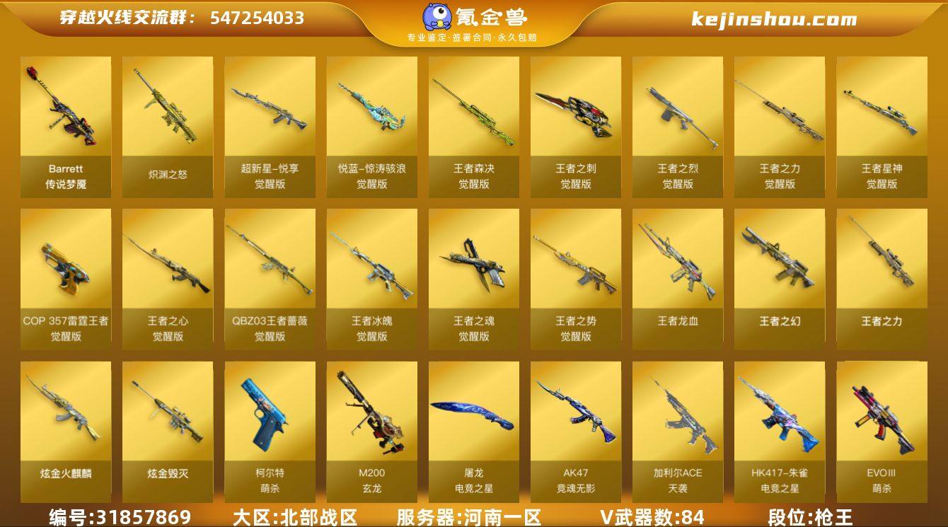 段位:枪王 VIP等级:VIP6 V武器数:84 王者武器数:17 炫金武器数:3 传说梦魇 炽渊之怒,超新星-悦享-觉醒版,悦蓝-惊涛骇浪-觉醒版,王者森决-觉醒版,王者之刺-觉醒版,王者之烈-觉醒版,王者之力-觉醒版,王者星神-觉醒版,COP 357-雷霆王者-觉醒版,王者之心-觉醒版,QBZ-03-王者蔷薇-觉醒版,王者冰魄-觉醒版,王者之魂-觉醒版,王者之势-觉醒版,王者龙血,王者之幻,王者之力 炫金火麒麟,炫金毁灭 AK47-竞魂无影,EVOⅢ-萌杀,G36C-序章,HK417-朱雀-电竞之星,加利尔ACE-天袭,柯尔特-萌杀,M200-玄龙,神威天绫,屠龙-电竞之星,FAMAS G2-天戎,M4A1-赤狱骑士,QBZ191-银翼,无影-神兵利器,AK47-B-身先士卒,尼泊尔-电竞装甲,USP-小动物,COP-堕天神,Glock18-武圣,AK47-黑武士-锦绣游龙,VSK-94-金蚀,AK47-火麒麟,AK47-无影,AK47-雷暴,AK47-黑武士,AK47-机械迷城,M4A1-雷神,黑骑士-海王,M4A1-黑骑士,M4A1-死神,M4A1-黑龙,M4A1-武圣,M4A1-猎神,M4A1-玫瑰精灵,白虎-电玩蓝兔,M200-幻神,Barrett-毁灭,Barrett-极光,Barrett-电竞装甲,蔷薇大炮,AWM-天龙,Kar98k-星神,AA-12-雷霆,AK12-天启,HK417-朱雀,QBZ03-金色蔷薇,Scar Light-白虎,9A91-烈火,屠龙,龙啸,麒麟刺,擎天,炽芒蝶刃,M200-竞技荣光,柯尔特-竞技荣光,USP-雷暴,擎天-竞技荣光,AK47-B-常胜将军,Barrett-暗月传说,柯尔特-电竞装甲,斩神刀-雷暴,AK47-B-战士,AK47-B-战神,AK-47-猩红传说,裁决,天神,G36C-幻影,龙啸-烈火龙威 王者-葵-貂蝉,王者葵-惊若翩鸿,王者凌霄 神威莲华,春,炽天使,电竞教官-云悠悠,机械姬,灵动武士,零,魅影,沙漠玫瑰,王者春,樱,樱-缤纷夏日,鹰,职业选手 HK417-朱雀-电竞之星-竞星跃动音效卡,屠龙-电竞之星-竞星跃动音效卡,天罚音效卡,M4A1-黑骑士音效卡,Barrett-毁灭音效卡,M4A1-雷神音效卡,AK47-火麒麟音效卡