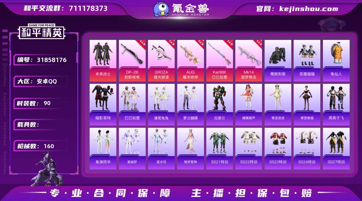 安卓 手Q-1粉装-10特效枪-0载具-2粉色飞行器-41713热力值-3王牌印记-90套装-160枪皮 【热门品类】:套装-AG战队服,套装-龟仙人,套装-暗影哥特 【粉色套装】:粉装-未来战士 【粉色枪皮等级】:GROZA-镜光银凌(五级),AUG-暖羊咩咩(五级),ACE32-萌骑漫游(五级),UMP45-萌骑冒险(四级),AKS-74U-森灵之息(五级),Kar98K-巳巳如意(五级),Mk14-甜梦熊击(五级),Mk14-福马献瑞(五级),AA12-G-萌骑幻想(五级),DP-28-豹影疾电(五级) 【粉色枪皮】:GROZA-镜光银凌,AUG-暖羊咩咩,ACE32-萌骑漫游,UMP45-萌骑冒险,AKS-74U-森灵之息,Kar98K-巳巳如意,Mk14-甜梦熊击,Mk14-福马献瑞,AA12-G-萌骑幻想,DP-28-豹影疾电 【粉色飞行器】:炫彩糖果飞行器,星之彼岸飞行器 【粉色降落伞】:星之彼岸降落伞,筑梦精灵降落伞,纯梦嫁纱降落伞,精灵梦叶罗丽降落伞,桃粉嫣然降落伞,雪月幻音降落伞,炫彩糖果降落伞 【稀有套装】:套装-龟仙人,套装-巳巳如意,套装-炫彩糖果,套装-马上有钱,套装-雏菊兔兔,套装-萝兰蝴蝶,角色-拉斐尔,套装-糖糖葫芦,套装-青团波波,角色-摩登魅猫,套装-燕燕于飞,套装-鱼渊荷华,套装-紫幽梦,套装-蓝冰羽,角色-瑰梦爱神,套装-雨过天青,套装-红釉青花 【稀有枪皮】:AKM-冰凉西瓜,AKM-彩虹符号,AKM-星之彼岸,AKM-龙的传人,M16A4-幻世战舞者,M16A4-甜心亚梦,SCAR-L-夜灯,SCAR-L-玉兔迎春,SCAR-L-红色方程式,M416-糯团青竹,M416-红色方程式,AUG-耀粉歌者,QBZ-彩虹符号,M762-天降萌叽,Mk47-妙红点点,G36C-星穹咏叹调,AC-VAL-甜心亚梦,蜜獾-天降萌叽,UZI-啾咪啾咪,UZI-天降萌叽,UMP45-夜灯,Vector-生命誓言,Vector-创世·救赎,汤姆逊-炫彩节奏,汤姆逊-耀粉歌者,野牛-沙丘之主,P90-飞驰魅影,P90-巳巳如意,Kar98K-彩虹符号,Kar98K-飞驰魅影,M24-幻彩电...