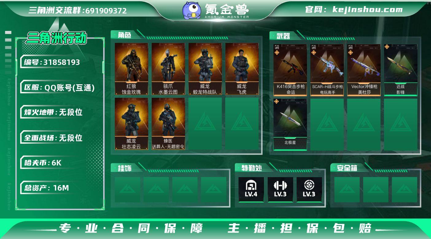 LJ4911总资产15.9M哈弗币6K近战武器-北极星,近战武器-影锋红狼蚀金玫瑰,骇爪水墨云图,威龙蛟龙特战队,威龙飞虎,威龙壮志凌云,蜂医送葬人无题密令K416突击步枪-命运(极品B),SCAR-H战斗步枪-电玩高手(优品C),Vector冲锋枪-美杜莎(优品c)无AW子弹0发三角币475仓库LV.6基础安全箱靶场LV.6训练中心LV.6无,红狼-蚀金玫瑰,骇爪-水墨云图,威龙-蛟龙特战队,威龙-飞虎,威龙-壮志凌云,蜂医-送葬人·无题密令,近战-北极星,近战-影锋,K416突击步枪-命运,SCAR-H战斗步枪-电玩高手,Vector冲锋枪-美杜莎
