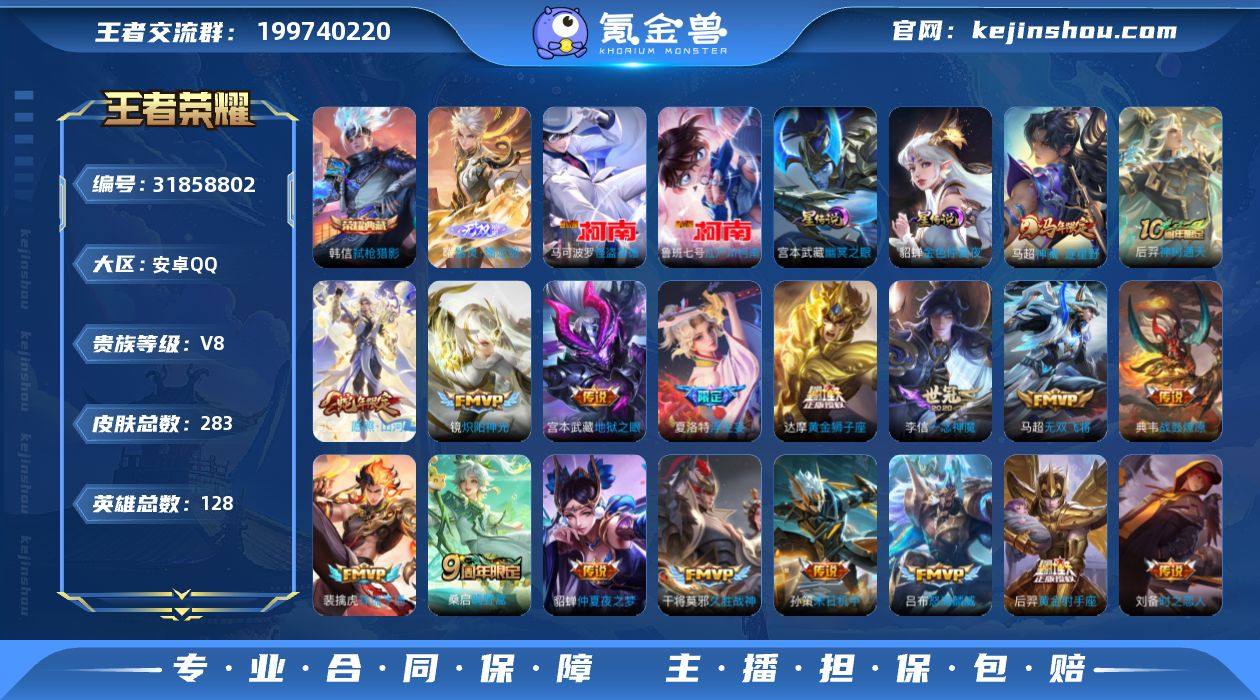 安卓Q-有二次-V8(77119分)-283皮-1典藏-1无双 -2珍品传说-24传说-7355场-16按键-1天幕-【最新段位以实际为准,截图仅供参考】 【英雄全皮】:敖隐全皮,蒙恬全皮,空空儿全皮,影全皮 【荣耀典藏】:韩信弑枪猎影 【无双皮肤】:曜器灵螭龙剑 【珍品传说】:鲁班七号江户川柯南,马可波罗怪盗基德 【传说皮肤】:马超神骥逐星野,后羿神树通天,司空震愿照山河定,裴擒虎祥瑞亨通,桑启鸣野蒿,典韦战鼓燎原,夏洛特浮生妄,吕布怒海麟威,百里守约碎云,马超无双飞将,孙策末日机甲,王昭君乞巧织情,镜炽阳神光,虞姬启明星使,李信一念神魔,刘备时之恋人,貂蝉猫影幻舞,张良黄金白羊座,干将莫邪久胜战神,达摩黄金狮子座,梦奇胖达荣荣,后羿黄金射手座,貂蝉仲夏夜之梦,宫本武藏地狱之眼 【限定皮肤】:蒙犽顽岩魄,蔡文姬夏日便利店,虞姬夏日便利店,姜子牙天穹之誓,杨戬破阵退雄兵,狄仁杰阴阳师,赵云皇家上将,赵云引擎之心,高渐离玩趣恶龙,吕布御风骁将,马可波罗暗影游猎,狄仁杰魔术师,达摩沙漠行僧,项羽海滩派对,关羽冰锋战神,兰陵王金庭之子,亚瑟潮玩骑士王,孙悟空至尊宝,李元芳云中旅人,虞姬启明星使,钟馗驱傩正仪,鬼谷子五谷丰年,黄忠烈魂,苏烈千军破阵,百里玄策原初追逐者,沈梦溪大漠名商,裴擒虎擒涛扼浪,米莱狄胡桃异想国,鲁班大师探海日志,桑启海盐诗旅,夏洛特浮生妄,艾琳流音漫舞,张良古海寻踪,蒙恬荣光圣徽,鬼谷子天穹祈灯,伽罗琥珀纪元,姬小满妄想食味,沈梦溪龙舞盛年,刘邦剑破天穹,程咬金群星魔术团,镜青焰无极,项羽苍威无极,刘备异域游侠,周瑜熔金海岸 【年限皮肤】:吕布御风骁将,司空震愿照山河定 【赛季限定】:钟馗驱傩正仪,苏烈千军破阵,达摩沙漠行僧,兰陵王金庭之子,沈梦溪大漠名商,李元芳云中旅人,桑启海盐诗旅,裴擒虎擒涛扼浪,...