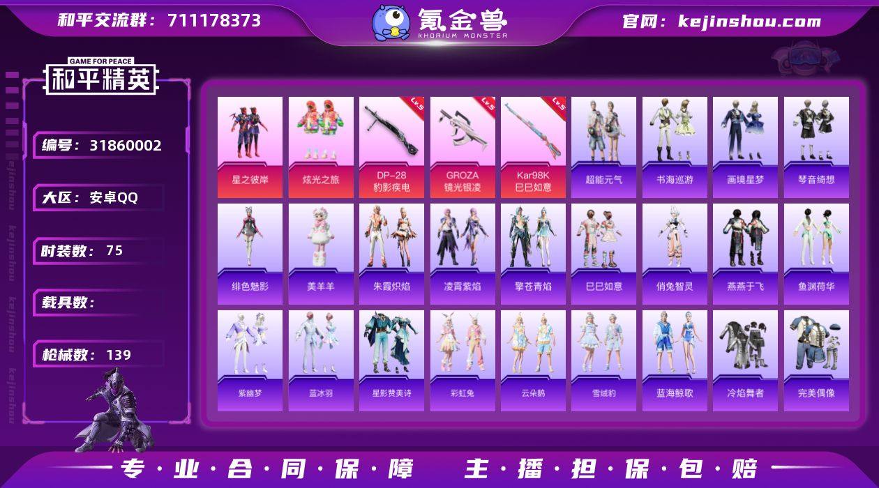 安卓 手Q-2粉装-6特效枪-0载具-1粉色飞行器-34455热力值-2王牌印记-75套装-139枪皮 【粉色套装】:粉装-星之彼岸,粉装-炫光之旅 【粉色枪皮等级】:GROZA-镜光银凌(五级),ACE32-萌骑漫游(二级),Kar98K-巳巳如意(五级),Mk14-福马献瑞(五级),AA12-G-萌骑幻想(一级),DP-28-豹影疾电(五级) 【粉色枪皮】:GROZA-镜光银凌,ACE32-萌骑漫游,Kar98K-巳巳如意,Mk14-福马献瑞,AA12-G-萌骑幻想,DP-28-豹影疾电 【粉色飞行器】:炫彩糖果飞行器 【粉色降落伞】:月影灵韵降落伞,喜羊羊与灰太狼降落伞,炫彩糖果降落伞,镜花水月降落伞 TD26022415 【稀有套装】:套装-巳巳如意,套装-超能元气,套装-雪国风尚,套装-炫彩糖果,套装-马上来财,角色-俏兔智灵,套装-燕燕于飞,套装-鱼渊荷华,套装-紫幽梦,套装-蓝冰羽,套装-星影赞美诗,套装-彩虹兔,套装-云朵鹅,套装-雪绒豹,套装-蓝海鲸歌,套装-朱霞炽焰,套装-凌霄紫焰,套装-擎苍青焰,玩偶服-美羊羊,角色-绯色魅影,套装-书海巡游,套装-画境星梦,套装-琴音绮想,角色-霜刃之御,套装-雨过天青,套装-红釉青花 【稀有枪皮】:AUG-冰晶雪宝,AKM-星之彼岸,AKM-破晓战魂,AKM-龙的传人,M16A4-幻世战舞者,SCAR-L-夜灯,SCAR-L-炫彩节奏,SCAR-L-玉兔迎春,M416-红色方程式,AUG-耀粉歌者,AUG-青春冒险家,M762-彩虹符号,M762-云朵鹅,G36C-星穹咏叹调,AC-VAL-闲梦青缨,蜜獾-天降萌叽,ACE32-画境星梦,ARX-凌霄紫焰,UZI-红色方程式,UMP45-夜灯,UMP45-炫光之旅,UMP45-绒宝小鹅,UMP45-极意拳锋,Vector-生命誓言,汤姆逊-耀粉歌者,汤姆逊-智耀战神,MP5K-画境星梦,JS9-凌霄紫焰,P90-巳巳如意,M24-炫彩节奏,VSS-星之彼岸,Mini14-耀粉歌者,SVD-云朵鹅,M1加兰德-画境星梦,S686-巳巳如意,S12K-玩趣呆呆,S12K-夜灯,DBS-彩虹符号,DBS-荧...