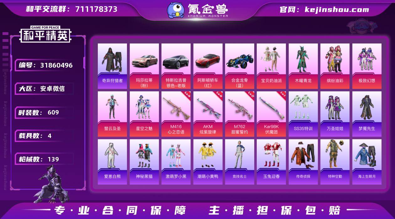 粉玛莎!猪脸!宝贝奶油派!合金龙骨蓝!【登入限制-介意勿拍!】D11093.安卓微信.140套装6粉装4载具116枪皮4粉枪-奇异狩猎者!4.9万热力值. 【稀有资产】套装-缤纷油彩/M416-心之恋语[4级]/小恶魔头饰/套装-奇异狩猎者/套装-潮萌小黄鸭 【粉色套装】套装-宝贝奶油派/套装-木曜青龙/套装-彗云及圣/套装-极致幻想/套装-星空之魅 【粉色枪皮】AKM-炫紫旋律[4级]/M762-甜蜜誓约[2级]/Kar98K-伏魔团[1级] 【载具】合金龙骨(蓝)/阿斯顿·马丁DBS(红)/玛莎拉蒂Ghibli(粉)/特斯拉Model X(冷光银) 【飞行器】炫紫旋律飞行器/伏魔团飞行器/心之恋语飞行翼