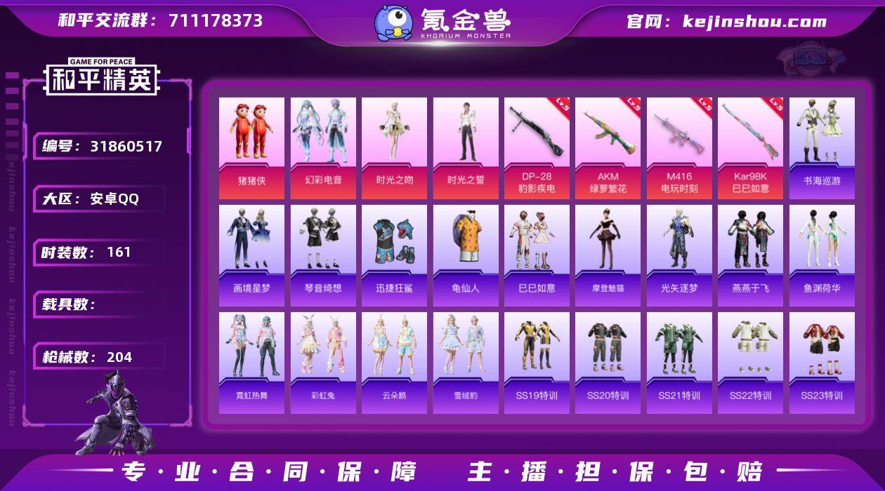 【AZH2873】安卓 手Q【二级艾丽娅 霁蓝缠春 摩登魅猫 暮色玫影AKM】1神装-5粉装-6特效枪-0载具-3粉色飞行器-59539热力值-16王牌印记-161套装-204枪皮 【红色神装等级】:暮色玫影-艾丽娅(二级) 【红色角色神装】:暮色玫影-艾丽娅 【热门品类】:套装-龟仙人 【粉色套装】:玩偶服-猪猪侠,粉装-幻彩电音,角色-时光之吻,角色-时光之誓,角色-霁蓝缠春 【粉色枪皮等级】:AKM-绿萝繁花(五级),AKM-暮色玫影(三级),M416-电玩时刻(五级),Kar98K-巳巳如意(五级),Mk14-福马献瑞(五级),DP-28-豹影疾电(五级) 【粉色枪皮】:AKM-绿萝繁花,AKM-暮色玫影,M416-电玩时刻,Kar98K-巳巳如意,Mk14-福马献瑞,DP-28-豹影疾电 【粉色飞行器】:炫彩糖果飞行器,暮色之舞飞行器,天空之门飞行器 【粉色降落伞】:恐龙拽拽降落伞,炫光之旅降落伞,御兔特攻降落伞,喜羊羊与灰太狼降落伞,异瞳寒姬降落伞,炫彩糖果降落伞,霁蓝缠春降落伞,暮色玫影降落伞,罪夜之冕降落伞 【稀有套装】:套装-龟仙人,套装-巳巳如意,套装-炫彩糖果,套装-马上有钱,角色-摩登魅猫,角色-光矢逐梦,套装-燕燕于飞,套装-鱼渊荷华,套装-霓虹热舞,套装-彩虹兔,套装-云朵鹅,套装-雪绒豹,套装-书海巡游,套装-画境星梦,套装-琴音绮想,角色-碧青流霞,角色-暖阳柴柴,角色-曹焱兵 【稀有枪皮】:AKM-彩虹符号,AKM-破晓战魂,AKM-霓虹街区,AKM-龙的传人,M16A4-幻世战舞者,M16A4-红色方程式,M16A4-蓝色火焰,SCAR-L-夜灯,SCAR-L-炫彩节奏,SCAR-L-玉兔迎春,SCAR-L-红色方程式,SCAR-L-银碳小老虎,M416-糯团青竹,M416-红色方程式,M416-蓝色火焰,GROZA-彩虹符号,GROZA-懵萌河马,GROZA-暮色玫影,AUG-天降萌叽,AUG-耀粉歌者,AUG-闲梦青缨,AUG-月影灵韵,QBZ-彩虹符号,QBZ-魔药课室,M762-天降萌叽,M762-彩虹符号,M762-云...