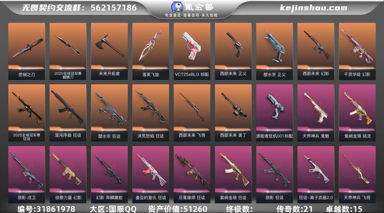 【自带包赔 可赔三倍】:精品号 库存价值51260 【限定】: 无畏契约季前邀请赛 悲悯之刃, 2025全球冠军赛 狂徒, 2025全球冠军赛 蝴蝶刀 【近战】: 无畏契约季前邀请赛 悲悯之刃, 2025全球冠军赛 蝴蝶刀, 落英飞旋, 未来开拓者 【狂徒】: 混沌序曲 狂徒, 洪荒怒焰 狂徒, 日冕雄师 狂徒, 2025全球冠军赛 狂徒, 紫阙金琅 狂徒, 盖亚的复仇 狂徒, 离子武器//2.0 狂徒, 掠影 狂徒, 塑水宗 狂徒 【幻影】: 异鳞魔蛇 幻影, 侦察力量 幻影, 西部未来 幻影, 千灵华绽 幻影 【冥驹】: 堕天遗武 冥驹 【正义】: 塑水宗 正义, 西部未来 正义 【戍卫】: 掠影 戍卫 【鬼魅】: 天界神兵 鬼魅 【骇灵】: 紫阙金琅 骇灵 【标配】: VCT25 x BLG 标配, 源能者危机001 标配 【飞将】: 天界神兵 飞将, 西部未来 飞将 【奥丁】: 紫阙金琅//2.0 奥丁, 西部未来 奥丁 【概要】: 总皮肤110 终极0 传奇 21卓越 15刀皮4英雄 28 LV270当前段位铂金 已使用1335R点 剩余10R点 可二次 卡面、挂饰、其他皮肤请看截图 道具、段位等以实际验号为准。如账号因没有维护,赛季更新等不可抗因素发生变化,不属于账号质量问题"