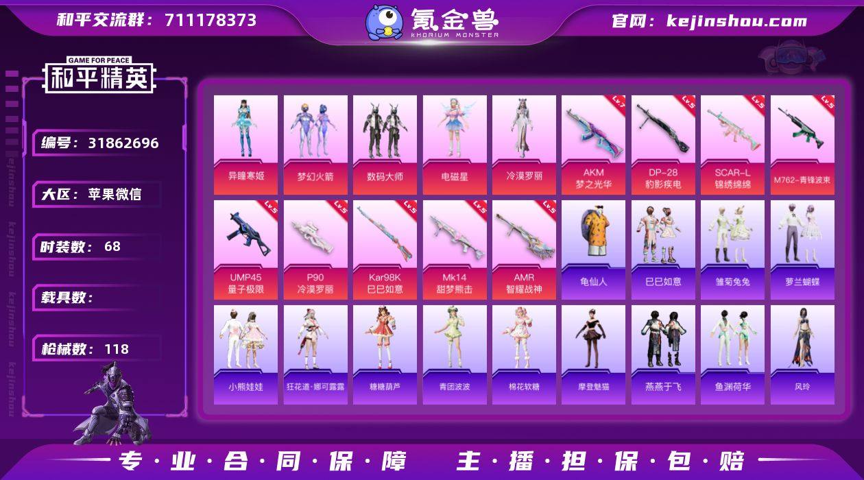 苹果微信 H-OWM0073【5粉装9特效枪1粉色飞行器 数码大师/梦幻火箭/电磁星/冷漠罗丽/异瞳寒姬/娜可露露/摩登魅猫/风玲/时希公主/灵公主/蝶吟花词/狂沙舞者/冰公主】39561热力值6王牌印记68套装118枪皮 【热门品类】:粉装-梦幻火箭,套装-龟仙人 【粉色套装】:粉装-数码大师,粉装-梦幻火箭,角色-电磁星,角色-冷漠罗丽,角色-异瞳寒姬 【粉色枪皮等级】:AKM-梦之光华(七级),SCAR-L-锦绣绵绵(五级),M762-青锋波束(五级),UMP45-量子极限(五级),P90-冷漠罗丽