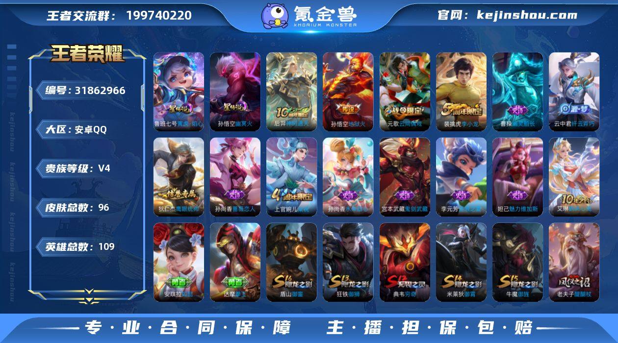 安卓Q-V4-荣耀黄金I段位-109英雄-96皮肤-2传说-11史诗 【传说皮肤】:后羿神树通天,孙悟空地狱火 【限定皮肤】:狄仁杰阴阳师,孙尚香蔷薇恋人,元歌云间偶戏,夏侯惇朔风刀,典韦穷奇,狄仁杰万华元夜,项羽海滩派对,老夫子醍醐杖,程咬金演武夺筹,亚瑟潮玩骑士王,牛魔御旌,钟馗驱傩正仪,鬼谷子原初探秘者,苏烈千军破阵,弈星混沌棋,明世隐疑决卦,裴擒虎李小龙,裴擒虎擒涛扼浪,狂铁御狮,米莱狄御霄,云中君纤云弄巧,盾山御銮,上官婉儿梁祝,鲁班大师探海日志,桑启海盐诗旅,张良古海寻踪,鬼谷子天穹祈灯,刘邦剑破天穹 【赛季限定】:典韦穷奇,狂铁御狮,米莱狄御霄,牛魔御旌,盾山御銮,夏侯惇朔风刀,弈星混沌棋,明世隐疑决卦,老夫子醍醐杖,鬼谷子原初探秘者,狄仁杰万华元夜,程咬金演武夺筹,钟馗驱傩正仪,苏烈千军破阵,桑启海盐诗旅,裴擒虎擒涛扼浪,鲁班大师探海日志,张良古海寻踪,鬼谷子天穹祈灯,刘邦剑破天穹 【战令限定】:元歌云间偶戏,亚瑟潮玩骑士王 【史诗皮肤】:元歌云间偶戏,云中君纤云弄巧,裴擒虎李小龙,上官婉儿梁祝,狄仁杰鹰眼统帅,李元芳逐浪之夏,曹操幽灵船长,妲己魅力维加斯,孙尚香水果甜心,孙尚香蔷薇恋人,宫...