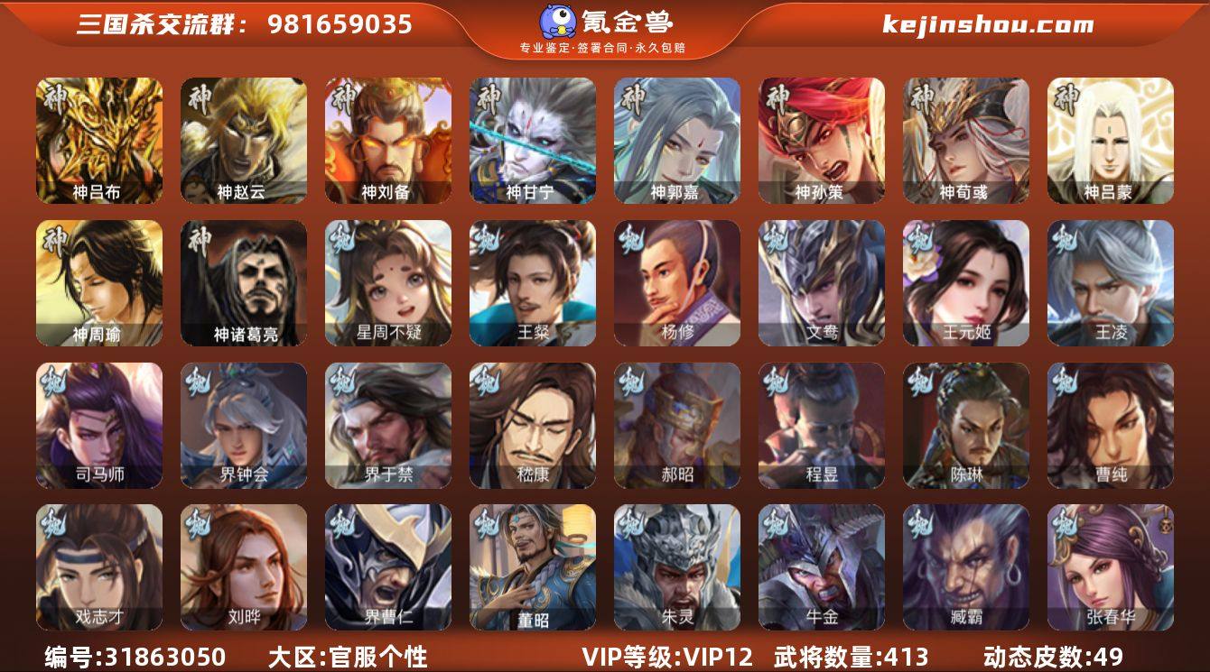VIP等级: VIP12 官阶: 大将军 武将数量: 413 动态皮肤数量: 49 神将: 神甘宁,神郭嘉,神刘备,神吕布,神孙策,神荀彧,神赵云,神吕蒙,神周瑜,神诸葛亮 魏国武将: 刘晔,戏志才,曹纯,陈琳,程昱,郝昭,嵇康,界于禁,界钟会,司马师,王凌,王元姬,文鸯,杨修,王粲,唐咨-魏,张辽,SP蔡文姬,SP曹仁,SP关羽,SP贾诩,SP姜维,SP庞德,卞夫人,曹昂,曹操,曹冲,曹洪,曹丕,曹仁,曹叡,曹嵩,贾逵,王异,鲁芝,界满宠,曹休,界曹植,满宠,荀攸,王基,钟繇,蒯越蒯良,郭嘉,荀彧,阮慧,杜畿,界郭嘉,崔琰,界曹丕,界荀彧,朱灵,界甄姬,吕虔,界王异,界许褚,华歆,陈群,界邓艾,界典韦,界曹休,袁涣,李通,乐进,辛宪英,郭淮,毛玠,界曹彰,郭皇后,毌丘俭,夏侯惇,曹植,司马朗,谋于禁,界曹操,星周不疑,许褚,界张辽,张郃,钟会,文聘,曹彰,界夏侯惇,诸葛诞,司马懿,甄姬,界徐晃,徐晃,界曹仁,孙资刘放,韩浩史涣,曹真,典韦,界夏侯渊,夏侯渊,李典,于禁,王双,邓艾,界司马懿,张春华,臧霸,牛金,朱灵(国战),董昭 蜀国武将: 董允,关索,花鬘,界黄忠,沙摩柯,王平,赵襄,周群,诸葛瞻,谋马超,谋赵云,谋黄忠,马云騄,徐庶,界魏延,杨仪,吕凯,界关羽,界诸葛亮,邓芝,界伊籍,费祎,严颜,界黄月英,赵云,张松,彭羕,李丰,界刘备,界刘禅,谋姜维,刘封,糜竺,李遗,谋庞统,黄月英,刘巴,关羽,王甫赵累,吴懿,界廖化,向宠,祝融,张飞,黄皓,魏延,界周仓,马忠,界法正,糜夫人,界孟获,刘禅,界赵云,界姜维,张翼,关银屏,界祝融,SP孙尚香,SP徐庶,卧龙诸葛,宗预,周仓,简雍,谋孟获,界关兴张苞,诸葛亮,孙乾,界张飞,界卧龙诸葛,法正,赵统赵广,陈到,界马岱,关平,马岱,界庞统,庞统,诸葛果,谋张飞,马谡,马超,廖化,关兴张苞,孟获,秦宓,吴苋,夏侯氏,姜维,黄忠,刘备,界马超,李严,马良,傅肜,蒋琬费祎,许靖,刘谌,彭羕(国战),甘夫人,蜀-糜芳傅士仁,SP甘夫人 吴国武将: 贺齐,界步练师,界徐盛,孙皓,吴景,周处,文鸯,潘濬,陆绩,张温...