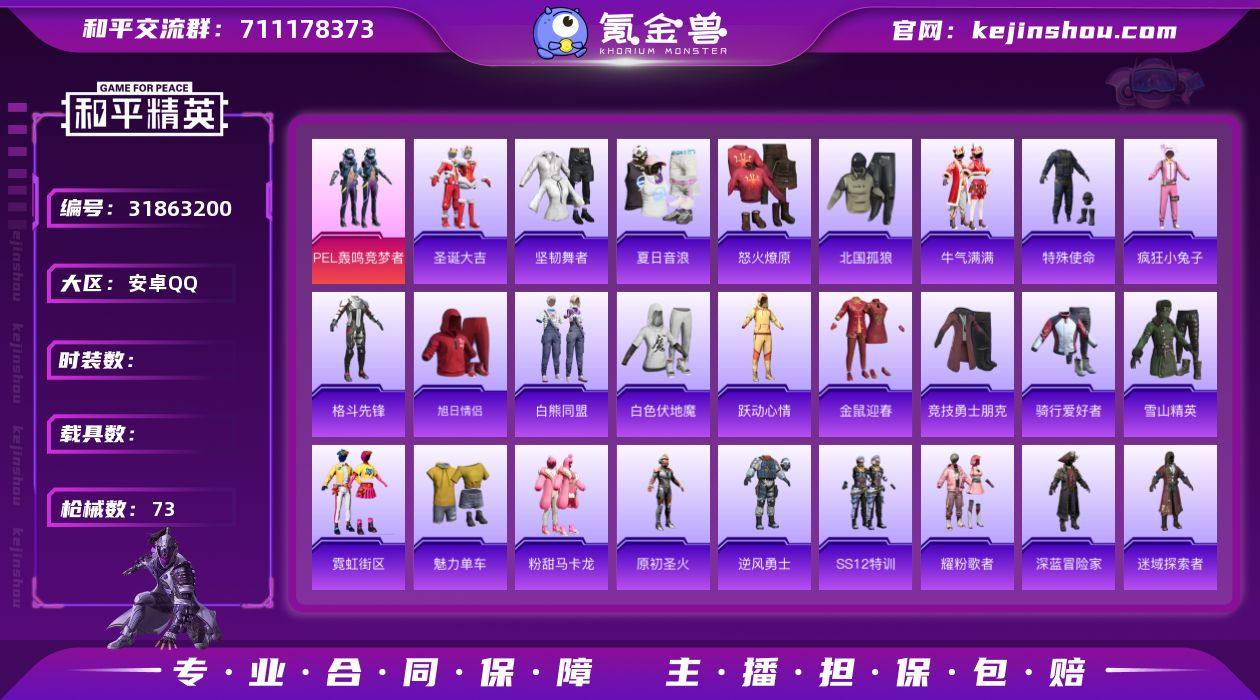 CH415+【连体号-1粉装-老六服-法斗尖角面罩-V7王者7传说-121皮肤-3太阳Q可二次】安卓Q区-1粉装-17917热力值-46套装-73枪皮【优质套装】: PEL轰鸣竞梦者【稀有武器皮肤】: M416-红色方程式 M416-乌木金纹 M416-蓝色火焰 M416-夜灯 AKM-乌木金纹 AKM-破晓战魂 AKM-霓虹街区 SCAR-L-红色方程式 SCAR-L-乌木金纹 SCAR-L-扶摇飞仙 SCAR-L-炫彩节奏 M16A4-夜灯 M16A4-生命誓言 GROZA-乌木金纹 GROZA-春暖花开 GROZA-黑色刀锋 GROZA-马卡龙 AUG-乌木金纹 AUG-魔法学院 QBZ-原初圣火 QBZ-乌木金纹 M762-拳皇97 M762-乌木金纹 M762-绯红前夜 M762-牛气冲天 Kar98K-红色方程式 Kar98K-彩虹符号 Kar98K-勇闯险境 M24-众神之王 SKS-勇闯险境 SKS-乌木金纹 SKS-夜灯 VSS-华贵君王 VSS-黑色刀锋 Mini14-生命誓言 Mini14-金鼠迎春 Mini14-原初圣火 Mini14-耀粉歌者 Mini14-乌木金纹 SLR-众神之王 SLR-四圣焕新 UZI-生命誓言 UZI-乌木金纹 UZI-红色方程式 UZI-众神之王 UMP45-生命誓言 UMP45-乌木金纹 UMP45-快乐主宰 Vector-乌木金纹 Vector-彩虹符号 Vector-黑色刀锋 汤姆逊-耀粉歌者 汤姆逊-乌木金纹 汤姆逊-勇闯险境 MP5K-众神之王 S686-乌木金纹 S686-深海曼妙 S1897-春暖花开 S1897-天启纪元 S1897-勇闯险境 S12K-乌木金纹 M249-拳皇97 M249-乌木金纹 DP-28-原初圣火 P92-拳皇97 P18C-原初圣火 平底锅-缤纷糖果 平底锅-众神之王 平底锅-原初圣火 平底锅-勇闯险境 平底锅-拳皇97 平底锅-黑色刀锋 撬棍-传奇侦探【其他套装】: PEL轰鸣竞梦者 雪山精英 迷域探索者 红酒骑士 云纹魔法士 金鼠迎春 夏日音浪 SS