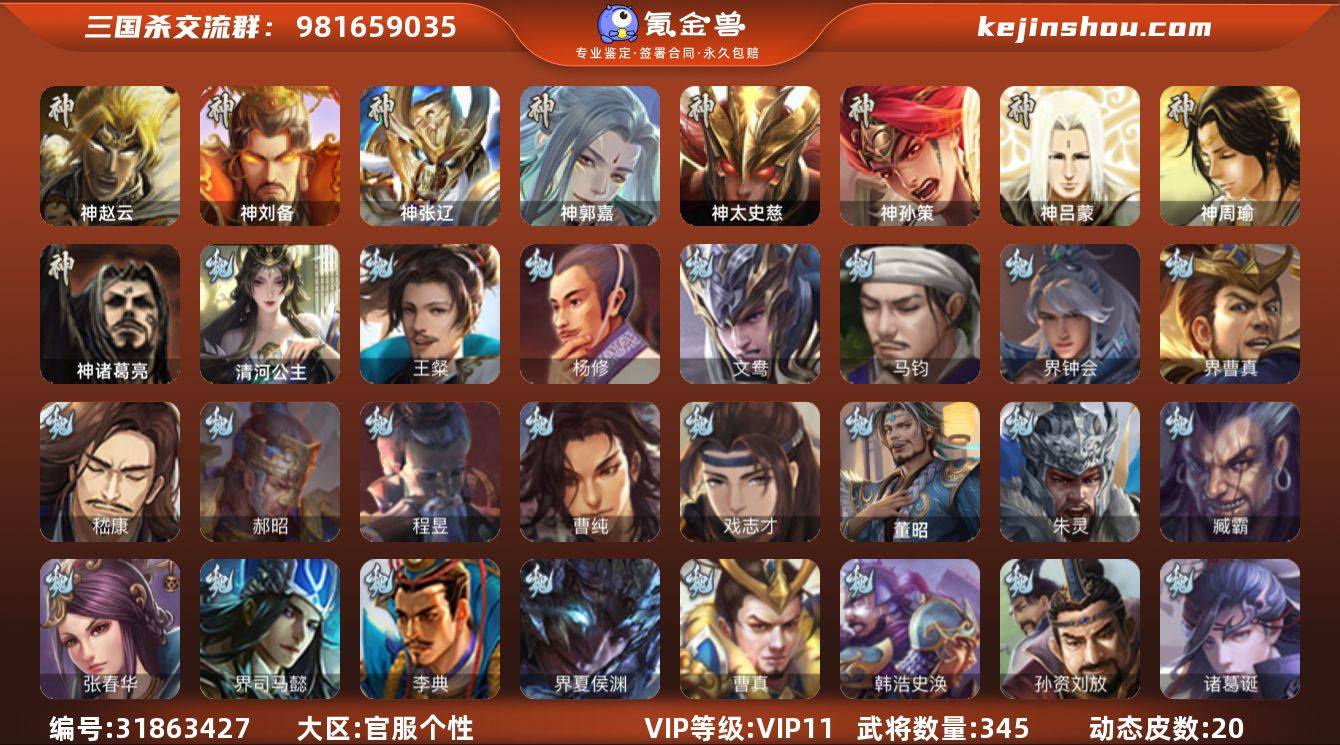 VIP等级: VIP11 官阶: 大将军 武将数量: 345 动态皮肤数量: 20 神将: 神郭嘉,神刘备,神孙策,神太史慈,神张辽,神赵云,神吕蒙,神周瑜,神诸葛亮 魏国武将: 戏志才,曹纯,程昱,郝昭,嵇康,界曹真,界钟会,马钧,文鸯,杨修,王粲,张辽,SP蔡文姬,SP关羽,SP贾诩,SP姜维,SP庞德,卞夫人,蔡贞姬,曹昂,曹操,曹冲,曹洪,曹丕,曹仁,曹叡,贾逵,王异,张恭,鲁芝,界满宠,界曹植,满宠,荀攸,王基,钟繇,郭嘉,荀彧,阮慧,杜畿,界郭嘉,崔琰,界荀彧,朱灵,辛毗,界陈群,界王异,界许褚,陈群,界邓艾,界典韦,司马孚,袁涣,李通,乐进,辛宪英,郭淮,毛玠,郭皇后,夏侯惇,曹植,司马朗,谋于禁,界曹操,许褚,界张辽,谋徐晃,张郃,钟会,文聘,曹彰,界夏侯惇,诸葛诞,司马懿,甄姬,徐晃,孙资刘放,韩浩史涣,曹真,典韦,界夏侯渊,夏侯渊,李典,于禁,邓艾,界司马懿,张春华,臧霸,朱灵(国战),清河公主,董昭 蜀国武将: 关索,花鬘,界黄忠,谯周,沙摩柯,诸葛瞻,谋马超,徐庶,杨仪,吕凯,界关羽,界诸葛亮,邓芝,界伊籍,费祎,严颜,界黄月英,界张嶷,赵云,张松,彭羕,李丰,界刘备,界刘禅,刘封,糜竺,蒋琬,谋庞统,黄月英,关羽,吴懿,界廖化,祝融,张飞,黄皓,陈震,魏延,界周仓,马忠,界法正,糜夫人,界孟获,刘禅,界赵云,界姜维,张翼,关银屏,界祝融,SP孙尚香,SP徐庶,卧龙诸葛,周仓,简雍,界关兴张苞,诸葛亮,界张飞,界卧龙诸葛,法正,界简雍,赵统赵广,界马岱,关平,马岱,界庞统,庞统,诸葛果,马谡,马超,廖化,关兴张苞,孟获,夏侯氏,姜维,黄忠,刘备,界马超,李严,马良,傅肜,蒋琬费祎,许靖,刘谌,彭羕(国战),甘夫人 吴国武将: 界步练师,界徐盛,界朱然,骆统,吴景,周处,文鸯,潘濬,张温,周泰,全琮,吕蒙,诸葛恪,界孙尚香,大乔小乔,谋周瑜,丁奉,谋吕蒙,周鲂,界全琮,孙茹,蒋钦,顾雍,孙亮,界朱治,孙休,严畯,界孙权,孙翊,界凌统,祖茂,界吕蒙,孙登,界孙策,凌操,朱治,孙尚香,程普,大乔,韩当,陆逊,诸葛瑾,朱然,吕范,太...