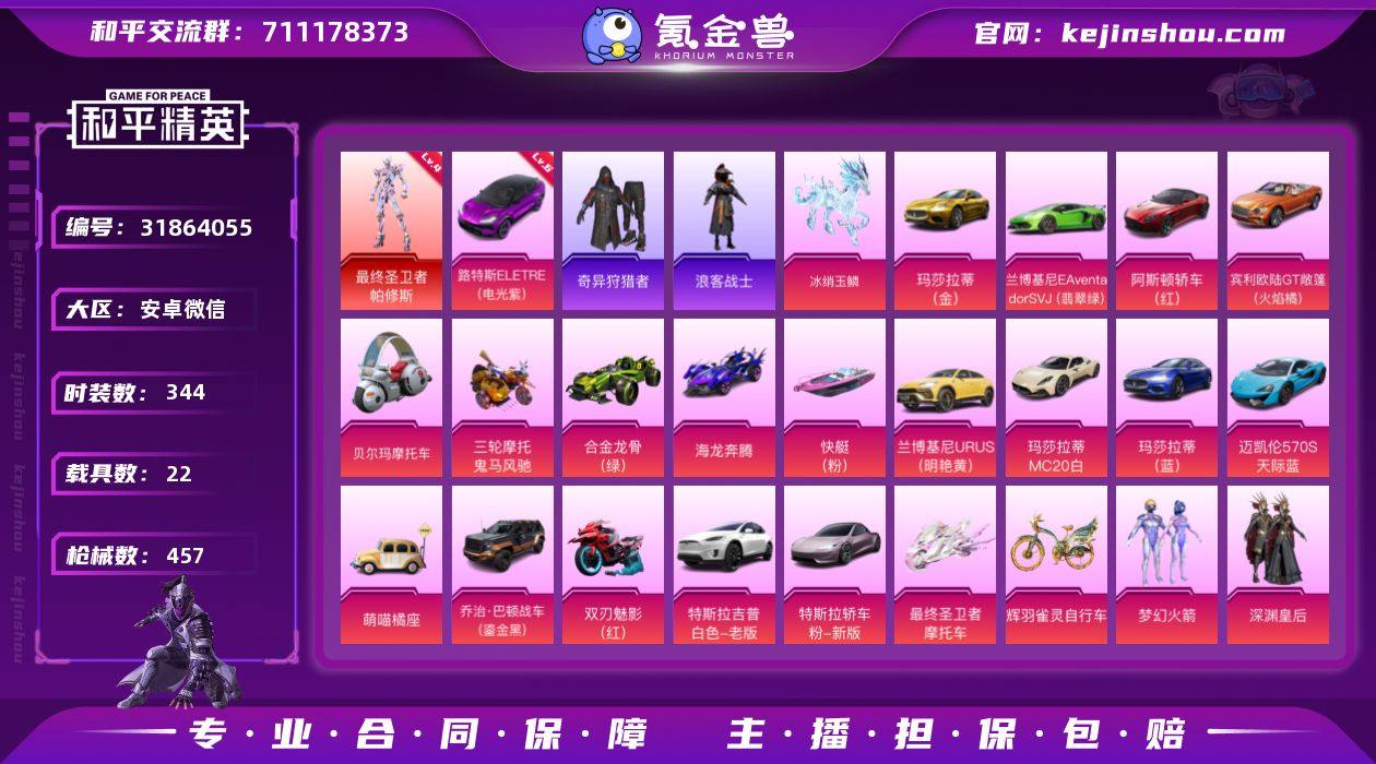 安卓微信 S-DWF031【1神装39粉装30特效枪1僚机22载具21粉色飞行器 六级路特斯/四级帕修斯 军刀雅典娜/奇异狩猎者/暗夜行者/浪客战士/火箭/浪漫波比/粉红小猪/深渊皇后/木曜青龙/星之信仰/新星烈龙/甜蜜誓约/心之恋语/幻彩马卡龙/锦绣火鲤/俏皮狐尾/香水柠檬/暗夜玫瑰/赛罗闪耀型/齐天大圣/洛天依/吟月归客/闪耀律动/紫电/赵灵儿】223341热力值-26王牌印记-344套装-457枪皮 【红色载具】:路特斯ELETRE(电光紫)(六级) 【红色神装等级】:最终圣卫者-帕修斯(四级)