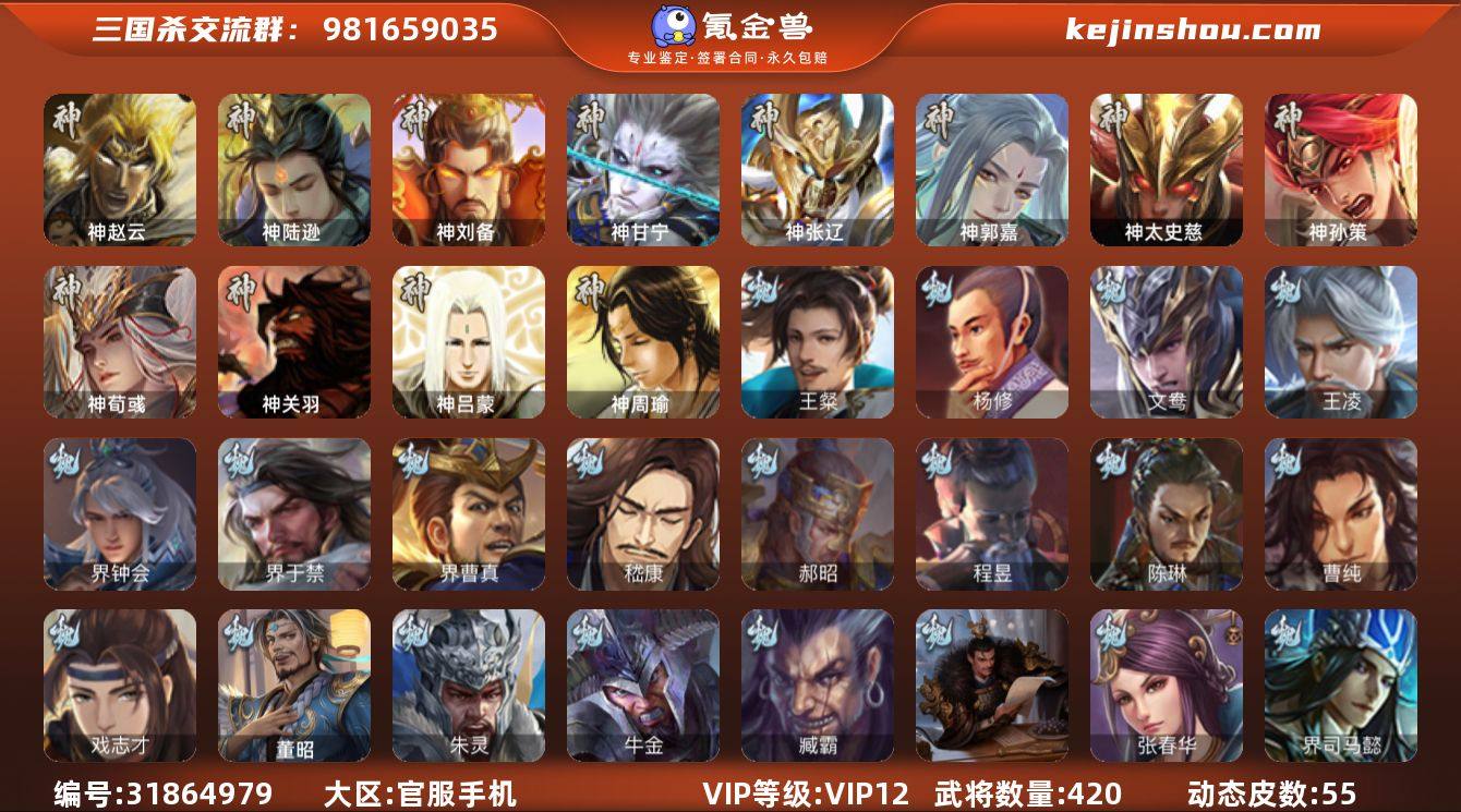 VIP等级: VIP12 官阶: 大将军 武将数量: 420 动态皮肤数量: 55 神将: 神甘宁,神郭嘉,神刘备,神陆逊,神孙策,神太史慈,神荀彧,神张辽,神赵云,神关羽,神吕蒙,神周瑜 魏国武将: 戏志才,曹纯,陈琳,程昱,郝昭,嵇康,界曹真,界于禁,界钟会,王凌,文鸯,杨修,王粲,唐咨-魏,张辽,SP蔡文姬,SP关羽,SP贾诩,SP姜维,SP庞德,卞夫人,蔡贞姬,曹昂,曹操,曹冲,曹洪,曹丕,曹仁,曹叡,王异,张恭,鲁芝,界满宠,曹休,界曹植,满宠,荀攸,王基,钟繇,蒯越蒯良,郭嘉,牵招,荀彧,阮慧,杜畿,界郭嘉,崔琰,界曹丕,界荀彧,朱灵,界甄姬,辛毗,吕虔,界陈群,界王异,界许褚,界郭淮,华歆,陈群,界曹休,袁涣,李通,乐进,辛宪英,郭淮,毛玠,界曹彰,郭皇后,毌丘俭,夏侯惇,曹植,司马朗,谋于禁,界曹操,许褚,界张辽,谋徐晃,张郃,钟会,文聘,曹彰,界夏侯惇,诸葛诞,司马懿,甄姬,界徐晃,徐晃,孙资刘放,韩浩史涣,胡班,曹真,典韦,界夏侯渊,夏侯渊,李典,于禁,王双,邓艾,界司马懿,张春华,孟达-魏,臧霸,牛金,朱灵(国战),董昭 蜀国武将: 关索,花鬘,界黄忠,傅佥,谯周,沙摩柯,王平,张星彩,赵襄,周群,诸葛瞻,谋马超,谋赵云,马云騄,徐庶,界魏延,杨仪,吕凯,界关羽,界诸葛亮,界伊籍,费祎,严颜,界黄月英,赵云,张松,彭羕,李丰,界刘备,界刘禅,刘封,糜竺,蒋琬,谋庞统,黄月英,关羽,王甫赵累,吴懿,界吴懿,界廖化,向宠,祝融,张飞,黄皓,陈震,魏延,界周仓,马忠,界法正,糜夫人,界孟获,刘禅,界赵云,张翼,关银屏,SP孙尚香,SP徐庶,卧龙诸葛,周仓,简雍,界关兴张苞,诸葛亮,界张飞,界卧龙诸葛,法正,界简雍,赵统赵广,陈到,界马岱,关平,马岱,界庞统,庞统,诸葛果,谋张飞,马谡,马超,霍峻,廖化,关兴张苞,孟获,秦宓,吴苋,夏侯氏,姜维,黄忠,刘备,界马超,李严,马良,傅肜,蒋琬费祎,许靖,刘谌,彭羕(国战),甘夫人,蜀-糜芳傅士仁,势陈到,势陈祗 吴国武将: 贺齐,界步练师,界徐盛,界朱然,留赞,骆统,孙寒华,孙皓,吴景,周...