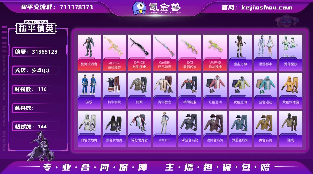【0载具 5特效枪 1粉装 144枪皮 116套装】套装-小丑鱼,角色-艾克斯奥特曼,角色-复仇流浪者,ACE32-萌骑漫游,Kar98K-巳巳如意,SKS-碧影闪光,UMP45-恐龙拽拽,DP-28-豹影疾电,编号:JJJRR06