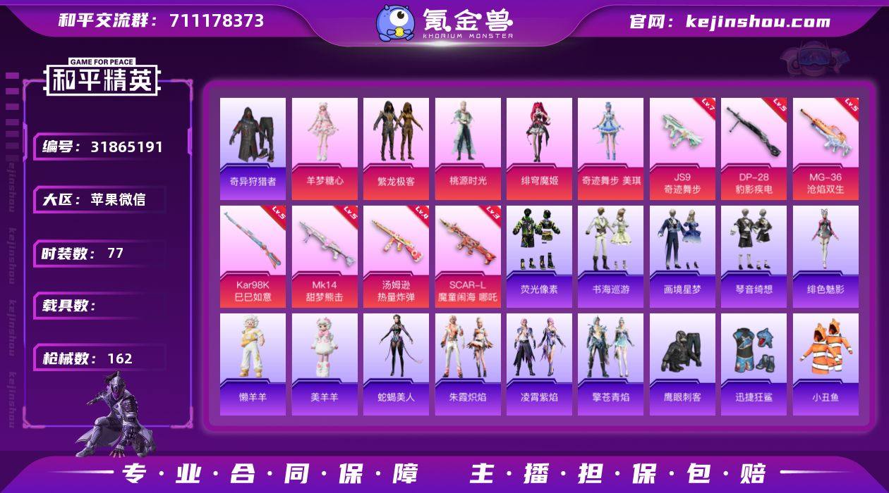 【AZH2879】苹果 微信【羊梦糖心美琪 美羊羊小丑鱼 满级奇迹舞步JS9】6粉装-10特效枪-0载具-5粉色飞行器-46202热力值-5王牌印记-77套装-162枪皮 【热门品类】:粉装-繁龙极客,套装-小丑鱼,套装-奇异狩猎者 【粉色套装】:粉装-繁龙极客,角色-桃源时光,角色-绯穹魔姬,角色-奇迹舞步 美琪,角色-羊梦糖心,角色-罪夜之冕 【粉色枪皮等级】:SCAR-L-魔童闹海 哪吒(三级),汤姆逊-热量炸弹(四级),AKS-74U-森灵之息(五级),JS9-奇迹舞步(七级),Kar98K-巳巳如意(五级),Mk14-甜梦熊击(五级),Mk14-福马献瑞(五级),AA12-G-萌骑幻想(二级),DP-28-豹影疾电(五级),MG-36-沧焰双生(五级) 【粉色枪皮】:SCAR-L-魔童闹海 哪吒,汤姆逊-热量炸弹,AKS-74U-森灵之息,JS9-奇迹舞步,Kar98K-巳巳如意,Mk14-甜梦熊击,Mk14-福马献瑞,AA12-G-萌骑幻想,DP-28-豹影疾电,MG-36-沧焰双生 【粉色飞行器】:炫彩糖果飞行器,智趣喵喵飞行器,飞天猪飞行器,灵珠游龙飞行器 【粉色降落伞】:绝对恒星降落伞,星之彼岸降落伞,炎氏战神降落伞,幻彩电音降落伞,绯穹魔姬降落伞,喜羊羊与灰太狼降落伞,魔童闹海 哪吒降落伞,异瞳寒姬降落伞,炫彩糖果降落伞 【稀有套装】:套装-荧光像素,套装-雪国风尚,套装-炫彩糖果,套装-马上有钱,套装-紫幽梦,套装-蓝冰羽,套装-极速光影,套装-彩虹兔,套装-云朵鹅,套装-雪绒豹,角色-时希公主,角色-绛羽幽主,套装-折梦之诗,套装-朱霞炽焰,套装-凌霄紫焰,套装-擎苍青焰,角色-蛇蝎美人,玩偶服-懒羊羊,玩偶服-美羊羊,角色-绯色魅影,套装-书海巡游,套装-画境星梦,套装-琴音绮想,套装-雨过天青,套装-红釉青花 【稀有枪皮】:AUG-冰晶雪宝,AKM-影袭,AKM-破晓战魂,M16A4-幻世战舞者,SCAR-L-夜灯,SCAR-L-玉兔迎春,M416-红色方程式,GROZA-影袭,GROZA-荧海星豚,M762-...