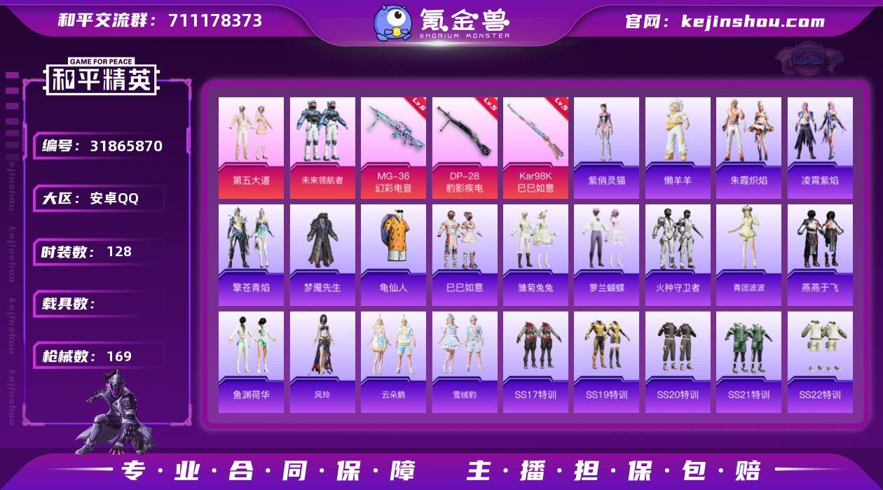 安卓 手Q-2粉装-4特效枪-0载具-0粉色飞行器-44743热力值-8王牌印记-128套装-169枪皮 QW2622607 【热门品类】:套装-龟仙人 【粉色套装】:粉装-第五大道,粉装-未来领航者 【粉色枪皮等级】:UMP45-萌骑冒险(一级),Kar98K-巳巳如意(五级),DP-28-豹影疾电(五级),MG-36-幻彩电音(六级) 【粉色枪皮】:UMP45-萌骑冒险,Kar98K-巳巳如意,DP-28-豹影疾电,MG-36-幻彩电音 【粉色降落伞】:炫光之旅降落伞,精灵梦叶罗丽降落伞,鬼刀降落伞,幻彩电音降落伞,异瞳寒姬降落伞,炫彩糖果降落伞 【稀有套装】:套装-龟仙人,套装-巳巳如意,套装-雏菊兔兔,套装-萝兰蝴蝶,套装-火种守卫者,套装-青团波波,套装-燕燕于飞,套装-鱼渊荷华,角色-风玲,套装-云朵鹅,套装-雪绒豹,套装-朱霞炽焰,套装-凌霄紫焰,套装-擎苍青焰,玩偶服-懒羊羊,角色-紫俏灵猫 【稀有枪皮】:AKM-灼热熔岩,AKM-生命誓言,AKM-破晓战魂,AKM-虎虎生威,AKM-龙的传人,AKM-灵猫魔法师,M16A4-幻世战舞者,M16A4-红色方程式,M16A4-蓝色火焰,SCAR-L-夜灯,SCAR-L-玉兔迎春,SCAR-L-红色方程式,SCAR-L-冷漠罗丽,M416-糯团青竹,M416-红色方程式,M416-蓝色火焰,GROZA-懵萌河马,GROZA-田园牧歌,AUG-天降萌叽,AUG-耀粉歌者,QBZ-彩虹符号,M762-天降萌叽,M762-云朵鹅,Mk47-妙红点点,G36C-懵萌河马,AC-VAL-天降萌叽,AC-VAL-快闪甜心,蜜獾-天降萌叽,蜜獾-娇憨猪猪,ARX-凌霄紫焰,UZI-天降萌叽,UZI-娇憨猪猪,UZI-红色方程式,UMP45-夜灯,UMP45-生命誓言,UMP45-蓝色火焰,Vector-焰鹰斗篷,Vector-生命誓言,Vector-田园牧歌,汤姆逊-天降萌叽,汤姆逊-耀粉歌者,AKS-74U-鬼刀,JS9-凌霄紫焰,P90-快闪甜心,P90-巳巳如意,Kar98K-红色方程式,AWM-焰鹰斗篷,SKS-炫彩节奏,SKS-迅猛狂鲨,VSS-田园牧歌,Mini14-旋转彩虹,Mini...