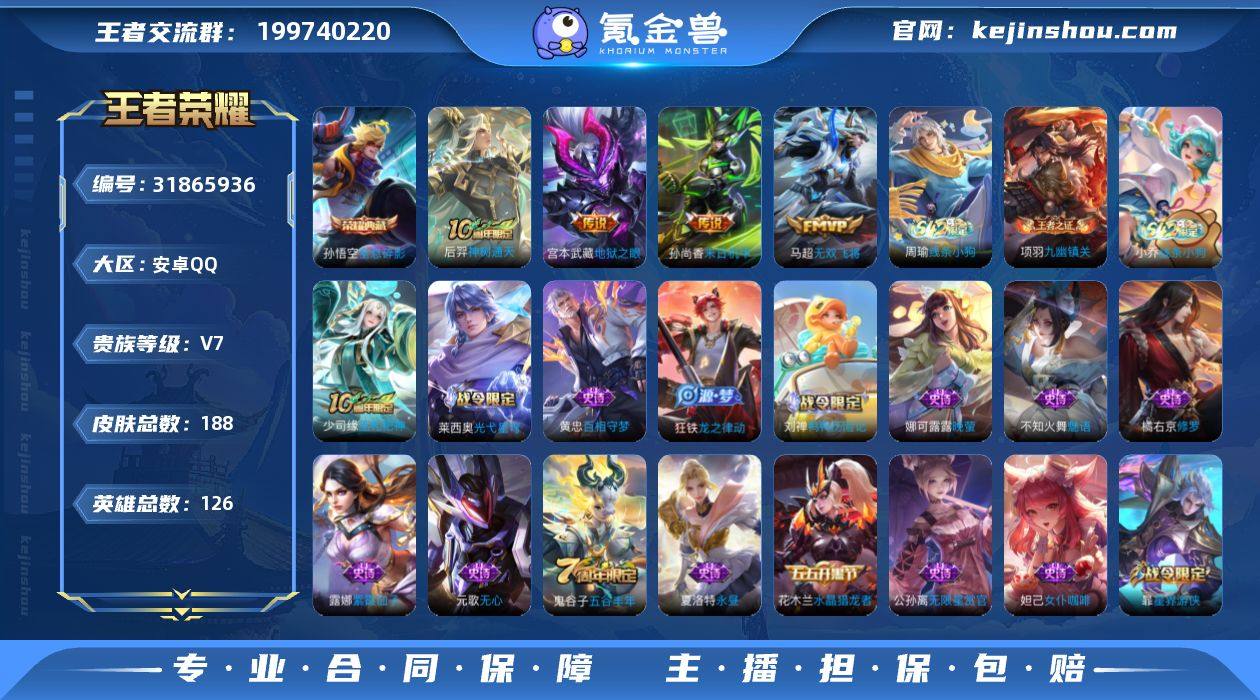 安卓Q-V4-最强王者段位-126英雄-163皮肤-12传说-43史诗 【英雄全皮】:影全皮 【传说皮肤】:后羿神树通天,司空震愿照山河定,澜愿照九州拓,裴擒虎祥瑞亨通,桑启鸣野蒿,马超无双飞将,王昭君乞巧织情,镜炽阳神光,李信一念神魔,干将莫邪久胜战神,后羿黄金射手座,宫本武藏地狱之眼 【限定皮肤】:姜子牙天穹之誓,狄仁杰阴阳师,赵云皇家上将,孙尚香蔷薇恋人,马可波罗山海玄木吟,狄仁杰魔术师,项羽海滩派对,韩信傲雪梅枪,女娲朔望之晖,百里玄策原初追逐者,裴擒虎擒涛扼浪,西施玲珑珍味,鲁班大师探海日志,戈娅驭风魔法,阿古朵江河有灵,张良古海寻踪,鬼谷子天穹祈灯,百里玄策超元猎域,沈梦溪龙舞盛年,鲁班七号蔬乡物语,李元芳蔬乡物语,刘邦剑破天穹,程咬金群星魔术团,镜青焰无极,项羽苍威无极,刘备异域游侠 【年限皮肤】:马可波罗山海玄木吟,司空震愿照山河定,澜愿照九州拓 【赛季限定】:裴擒虎擒涛扼浪,鲁班大师探海日志,张良古海寻踪,鬼谷子天穹祈灯,刘邦剑破天穹,姜子牙天穹之誓,东皇太一噬灭天穹,太乙真人谧流熔炉,钟馗虚灵犬护,甄姬逆浪荇歌,亚瑟荣光之誓,百里玄策原初追逐者,牛魔星界战将,项羽九幽镇关 【战令限定】:女娲朔望之晖,戈娅驭风魔法,西施玲珑珍味,鲁班七号蔬乡物语,李元芳蔬乡物语,镜青焰无极,项羽苍威无极,周瑜线条小狗 【史诗皮肤】:周瑜线条小狗,项羽九幽镇关,女娲万灵启世,西施织梦人,黄忠百相守梦,阿轲化蝶舞,赵怀真器灵浮梦炉,牛魔星界战将,镜青焰无极,鲁班七号蔬乡物语,百里玄策超元猎域,阿古朵江河有灵,戈娅驭风魔法,刘禅电玩爆裂旋风,马可波罗山海玄木吟,澜赏金猎手,韩信傲雪梅枪,百里玄策原初追逐者,不知火舞魅语,狄仁杰鹰眼统帅,大乔猫狗日记,阿轲节奏热浪,刘禅天才门将,铠曙光守护者,安琪拉心灵骇客...