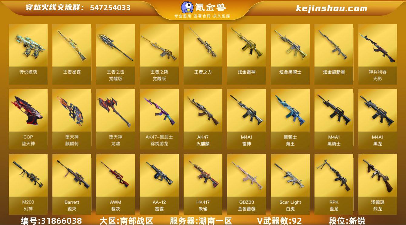 湖南一区-102V-5王者武器数-4炫金武器数 【传说武器】:传说破晓 【传说角色】:传说影煞 【热门武器】:传说破晓,QBZ03-金色蔷薇,Scar Light-白虎,HK417-朱雀,M200-幻神,M4A1-黑骑士*4,汤姆逊-烈龙*6,RPK-盘龙*5,加特林-炼狱*3,斯泰尔-蝴蝶,火麒麟-绝迹,USP-雷暴,COP-堕天神,沙鹰-修罗*3,炽芒蝶刃 【王者炫金武器】:王者之力,王者星霆,炫金骑士*2,炫金雷神,炫金超新星 【音效卡】:AK47-火麒麟音效卡,M4A1-雷神音效卡,M4A1-黑骑士音效卡,Barrett-毁灭音效卡,绝迹语音包 【皮肤】:M200-幻神-N9-2022MVP,QBZ03-N9-2023MVP 皮肤,雷神-荣耀之魄,雷神-宠儿-2019MVP,火麒麟-平天大圣,毁灭-星空,毁灭-黑大圣皮肤,M4A1-黑龙-361,黑骑士-暗月,黑骑士-冠军之势,天启-暗月,AK47-B-常胜将军-曹操,AK47-B-常胜将军-刘备,AK47-B-常胜将军-孙权,极光-能量核心,炼狱-末日审判 皮肤,屠龙-荣耀之锋,屠龙-星火燎原 【角色】:零,樱,瞳,春,迷迭香,审判者,王者-瞳-闭月羞花,王者-葵-貂蝉,炽天使,空,暗夜-X,初恋灵狐,芳心审判者,风暴女,娟娟,兰-新年限定,灵狐-花神,灵狐者-黄金海岸,灵狐者-七夕宝贝,灵狐者-职业经理,龙儿,龙儿-小淘气,麻雀,曼陀罗-礼服,潘多拉-X,潘多拉-甜心教官,潜龙队-X,邱刚敖,蜀雪,新灵狐者,新娜塔莎,影武者-X,职业选手 【人偶武器】:火麒麟-绝迹,斯泰尔-蝴蝶,AWM-灵狐-15周年嘉年华,迷你牛魔王,迷你生化手雷,迷你艾比,迷你巨石泰坦-魔花研究所,AK12-夜玫瑰 【暴走生化】:超级对讲机 【挑战大师】:神圣爆裂者III,激光毁灭者III,KAC-圣炎切割者III,神圣爆裂者-末日III 【英雄级武器】:AK47-火麒麟,M4A1-黑龙,M4A1-雷神,M4A1-黑骑士*4,HK417-朱雀,Scar Light-白虎,无影-神兵利器,黑武士-锦绣游龙,QBZ03-金色蔷薇,...