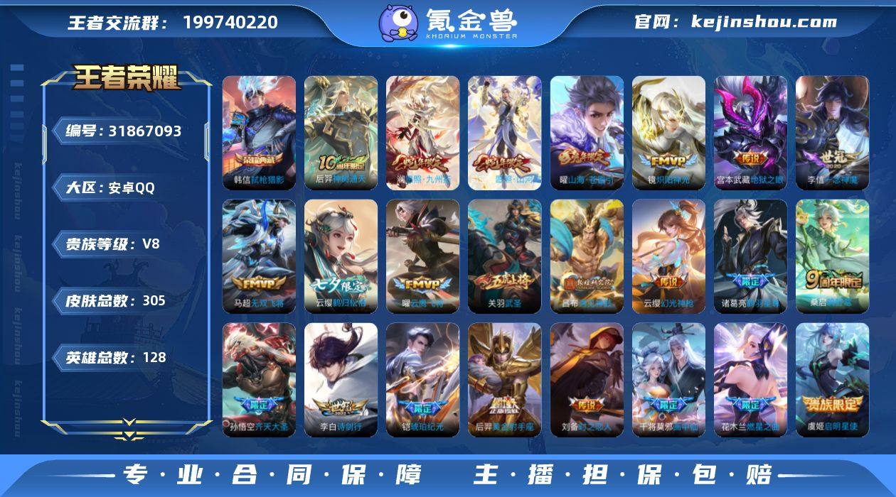 安卓Q-V7-尊贵铂金II段位-128英雄-361皮肤-4典藏皮肤-1典藏英雄-26传说-97史诗【英雄全皮】:刘邦全皮,李信全皮,夏洛特全皮,戈娅全皮,影全皮【荣耀典藏】:武则天英雄,孙悟空全息碎影,武则天倪克斯神谕,李白鸣剑曳影,铠银白咏叹调【传说皮肤】:后羿神树通天,西施续相思,澜愿照九州拓,桑启鸣野蒿,铠冥王哈迪斯,诸葛亮鹤羽星尊,夏洛特浮生妄,李信山海炽霜斩,李白诗剑行,百里守约碎云,后羿无尽星芒,露娜启示之音,孙策末日机甲,孙尚香异界灵契,赵云淬星耀世,西施游龙清影,诸葛亮时雨天司,铠绛天战甲,虞姬启明星使,孙悟空零号赤焰,曜云鹰飞将,李信一念神魔,刘备时之恋人,伽罗太华,后羿黄金射手座,貂蝉仲夏夜之梦【限定皮肤】:铠冥王哈迪斯,狄仁杰阴阳师,赵云皇家上将,赵云龙胆,赵云百木心枪,墨子神迹守卫,嬴政优雅恋人,孙尚香蔷薇恋人,孙尚香异界灵契,鲁班七号乒乒小将,庄周高山流水,阿轲迷踪丽影,钟无艳超时空战士,孙膑天狼运算者,扁鹊奇幻香踪,白起夜都怪侠,芈月重明,芈月幻夜卜梦,吕布御风骁将,元歌云间偶戏,元歌无心,夏侯惇朔风刀,甄姬落雪兰心,典韦岱宗,马可波罗暗影游猎,狄仁杰魔术师,狄仁杰万华元夜,达摩星际陆战队,达摩沙漠行僧,项羽海滩派对,老夫子醍醐杖,老夫子航海奇遇记,程咬金演武夺筹,露娜启示之音,刘邦夺宝奇兵,韩信傲雪梅枪,王昭君午后时光,兰陵王金庭之子,亚瑟潮玩骑士王,孙悟空零号赤焰,孙悟空孙行者,后羿圣弓游侠,后羿无尽星芒,李元芳云中旅人,虞姬启明星使,钟馗驱傩正仪,杨玉环遇见飞天,杨戬潮玩骑兵,干将莫邪真爱魔法,雅典娜单词大作战,蔡文姬繁星吟游,鬼谷子原初探秘者,鬼谷子五谷丰年,诸葛亮时雨天司,诸葛亮鹤羽星尊,黄忠火炮绅士,苏烈千军破阵,百里守约朱雀志,弈星混沌棋,沈梦溪大漠名商,明...
