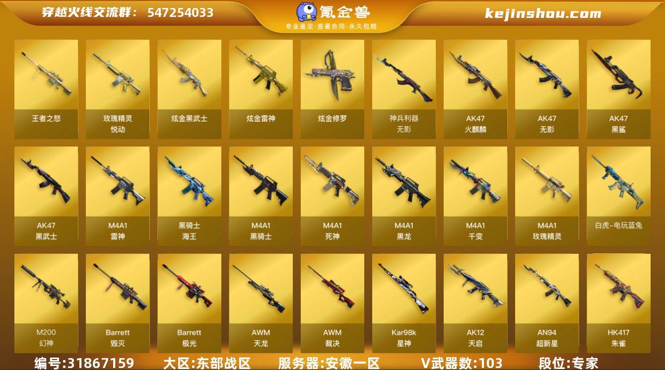 【幻神三件套】【幻神1皮】【6烈龙】【死亡之眼】【斯泰尔-蝴蝶】【6盘龙】【M200-幻神】【M200-幻神-荣耀世冠白鲨】【M200-幻神音效卡】【Kar98K-星神】【AWM-裁决】【Scar Light-白虎】【Scar Light-白虎音效卡】【白虎-电玩蓝兔】【QBZ03-金色蔷薇】【HK417-朱雀】【黄金猫猫手套-白鲨】【加特林-炼狱】【RPK-盘龙】【魂·炼狱-玩具枪】【汤姆逊-烈龙】【斯泰尔-蝴蝶】【死亡之眼】【葵】【乔伊教练】【瞳】【王者春】【王者零-华冠丽服】【樱】【M4A1-雷神】【雷神-能量核心】【雷神-耀金皮肤】【雷神-暗月】【M4A1-雷神音效卡】【AK47-火麒麟】【火麒麟-心动糖果】【火麒麟-CFSTAR】【M4A1-黑骑士】【M4A1-黑骑士音效卡】【M4A1-黑龙】【黑龙-暗月】【Barrett-毁灭】【巴雷特-毁灭-CFPL冠军】【毁灭耀金皮肤】【Barrett-毁灭音效卡】安徽一区-106V-8王者-4炫金 【热门武器】:QBZ03-金色蔷薇,Scar Light-白虎,HK417-朱雀,M200-幻神,死亡之眼*4,白虎-电玩蓝兔,Kar98K-星神,M4A1-黑骑士*4,汤姆逊-烈龙*7,RPK-盘龙*6,加特林-炼狱,斯泰尔-蝴蝶,沙鹰-修罗*6,黄金猫猫手套-白鲨 【王者炫金武器】:炫金雷神,炫金修罗,炫金武士*2,玫瑰精灵-悦动*2,王者之怒 【音效卡】:M200-幻神音效卡,M4A1-雷神音效卡,M4A1-黑骑士音效卡*2,Barrett-毁灭音效卡,Scar Light-白虎音效卡 【稀有皮肤】:M200-幻神-荣耀世冠白鲨,雷神-能量核心,雷神-耀金皮肤,火麒麟-心动糖果,毁灭耀金皮肤,天龙-能量核心,AWM-天龙-传奇70KG,天神-暗月 【角色】:王者零-华冠丽服,王者春,葵,樱,瞳,铁骑荣耀 【人偶武器】:斯泰尔-蝴蝶,AWM-灵狐-15周年嘉年华,COP-旗袍,迷你深渊冰龙,迷你超能女侍,迷你生化手雷*3,闪光弹-小乔,闪光弹-貂蝉,高爆手雷-大乔 【暴走生化】:斯泰尔-蝴蝶,死亡之眼*4,超级对讲机 【...