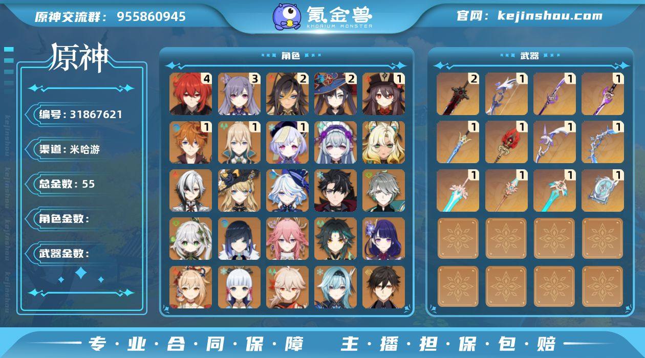 邮箱: 不送邮/死邮 总黄数: 55 冒险等级: 59 4命金色角色: 四命迪卢克 3命金色角色: 三命刻晴 2命金色角色: 二命莫娜,二命迪希雅 1命金色角色: 一命七七,一命达达利亚,一命琴,一命胡桃 0命金色角色: 枫原万叶,优菈,神里绫华,宵宫,可莉,钟离,魈,雷电将军,八重神子,夜兰,纳西妲,艾尔海森,莱欧斯利,芙宁娜,娜维娅,阿蕾奇诺,希诺宁,梦见月瑞希 2精武器: 狼的末路 1精武器: 雾切之回光,四风原典,阿莫斯之弓,天空之傲,天空之刃,天空之脊,护摩之杖,薙草之稻光,苍古自由之誓,冬极白星,若水