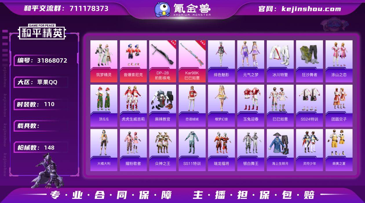 M1046569【素材号】苹果手Q-2粉装-2特效枪-110套装-148枪皮-5王牌印记-坚韧铂金Ⅳ-41913热力值【2粉装】音爆索尼克,筑梦精灵【2特效枪】Kar98K-巳巳如意[4级],DP-28-豹影疾电[5级]【2稀有】狂沙舞者,TJB战队服【7飞行器】光之冒险尾迹,红色滑翔尾迹,异域银装飞行器,破刃行动尾迹,粉色滑翔尾迹,炫彩糖果飞行器,星夜魔法师飞行翼【1头盔】夏日绵绵冰头盔【252其它衣服和枪皮】漫游都市,灼焰舞者,飞驰魅影,恋语绒绒,竞技达人朋克,SS16特训,时空追击者,炫彩糖果,薄荷星砂,吉莉礼服,SS11特训,大橘大利,绮丽涂鸦,元气之梦,探宝勇士,青春冒险家,SS17特训,SS34特训,青翼流星,萌鸡速递,SS31特训,潮流游乐家,春日漫步,破晓战魂,炫蓝之夏,空投萌叽,甜心亚梦,暗黑骑手,热血青春,暴风机械师,极地朋克,耀眼新星,夏日音浪,角色-无面战甲,SS36特训,红色运动,镭射皇者,海上生明月,旭日情侣,SS21特训,灵符少年,SS24特训,耀粉歌者,牛气冲天,角色-绯色魅影,异彩先驱,滨海假日,SS19特训,冰川特警,SS33特训,青涩时光,幻世战舞者,SS18特训,SS13特训,龙腾端午,玉兔迎春,SS12特训,橘黑制服,瑞龙福将,滨海厨神,水晶王族,极速竞梦,魅力单车,银白舞王,牛气满满,初雨海棠,白色伏地魔,霓虹极客,战术大师,爆裂葡萄,SS37特训,音速流光,SS20特训,虚音幻奏,白熊同盟,光之冒险,甜蜜熊情侣,巳巳如意,SS35特训,樱梦幻音,特种颜团子,SS32特训,霓虹街区,萌趣颜团子,格斗先锋,王牌教练,甜蜜告白,SS15特训,涂山之恋,团圆交子,萌黄之夏,竞技名士,长空猛禽,虎虎生威吉莉,SS14特训,蓝彩潮人,都市漫游者,众神之王,飞行日记,猛禽,野性战心,福星高照,柠萌假日,顶瓜瓜,麻辣教官,特训学院,S1897-飞驰魅影,汤姆逊-异彩先驱,AUG-青春冒险家,SLR-月影鸳鸯,燃点复合弓-罪夜之冕,SKS-青丘仙客,PKM-啾咪啾咪,ACE32-冰晶雪宝,M762-镭射皇者,UZI-墨染幽