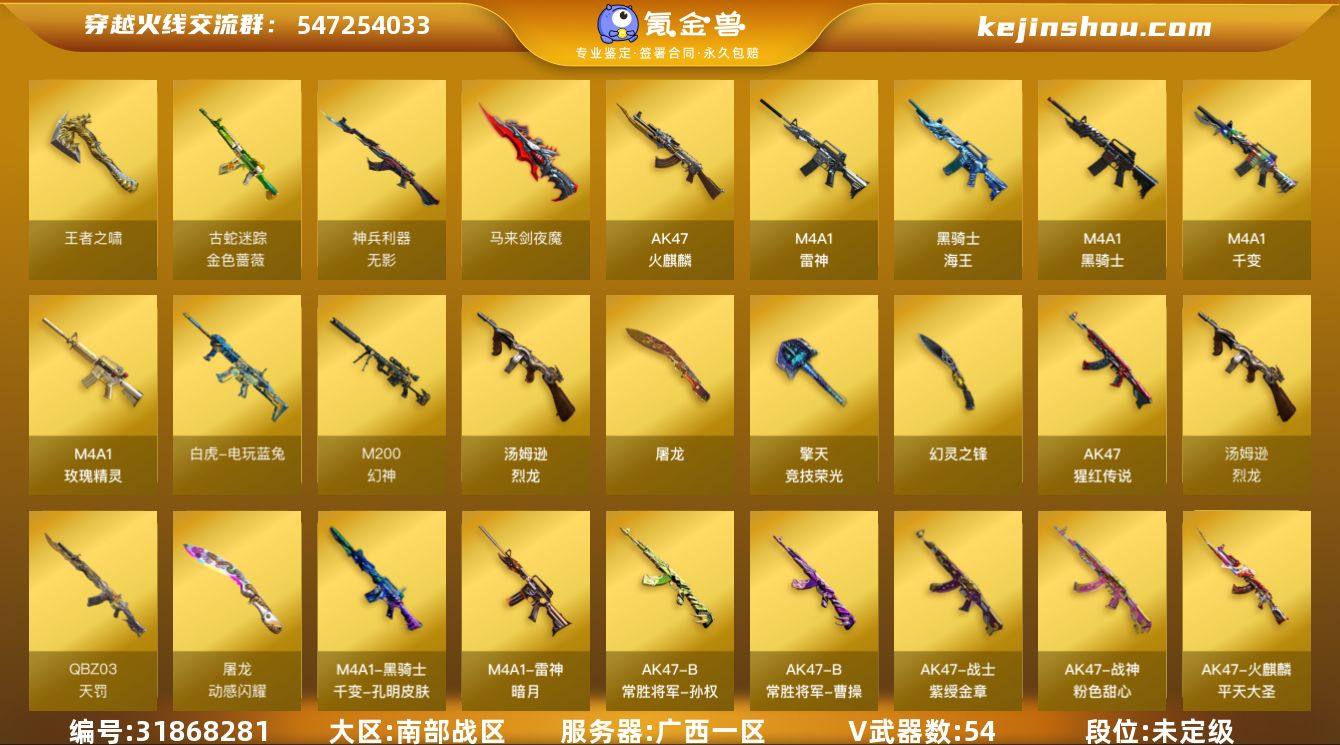 广西一区-56V-3王者武器数-0炫金武器数 【热门武器】:M200-幻神,金色蔷薇-古蛇迷踪,修罗-古蛇迷踪,白虎-电玩蓝兔,M4A1-黑骑士,汤姆逊-烈龙*6,金色蔷薇-空 【王者炫金武器】:王者青龙,王者之啸 【音效卡】:M200-幻神音效卡,炼狱-百战金芒-庆典舞曲音效卡 【皮肤】:幻神-周瑜皮肤,幻神-动感闪耀 皮肤,雷神-暗月*2,雷神-荣耀之魄,雷神-宇航兔皮肤,雷神-炽焰魔龙,M4A1-再燃火线,雷神-神秘按键 皮肤,火麒麟-平天大圣,M4A1-千变-孔明皮肤,战神-粉色甜心皮肤*2,战神-紫绶金章皮肤,AK47-B-常胜将军-曹操,AK47-B-常胜将军-孙权,轻型军用手斧-再燃火线 【角色】:炫,妮妮,王者-葵-貂蝉,蛇隐宗,乔伊教练,葵-阿尔法武装,初恋灵狐,芳心审判者,嘉年华灵狐,娟娟,零-水下丽影,曼陀罗-X,潜龙队-X,蛇姬,斯沃特-X,铁骑荣耀,兔囡囡,雪莉杨 【人偶武器】:金色蔷薇-空,天龙-乔伊教练,AWM-灵狐-15周年嘉年华,迷你波特博士*2,夺魂,迷你生化手雷,生化手雷-机甲核心*3,深渊终结者手雷,迷你超能女侍,灵狐娃娃手雷 【暴走生化】:超级对讲机 【挑战大师】:AK47-冰龙粉碎者,冰龙粉碎者-白马银枪,激光毁灭者III,神圣爆裂者-末日III 【英雄级武器】:M4A1-千变,AK47-火麒麟,M4A1-雷神*2,M4A1-黑骑士,QBZ03-天罚,无影-神兵利器,金色蔷薇-古蛇迷踪,M4A1-玫瑰精灵,AK-47-猩红传说,黑骑士-海王*2,白虎-电玩蓝兔,M200-幻神,炼狱-百战金芒,汤姆逊-烈龙*6,天神-动感闪耀,修罗-古蛇迷踪,屠龙*2,马来剑-夜魔,幻灵之锋,擎天-竞技荣光,屠龙-动感闪耀,麒麟刺-百战金芒,高爆手雷-夜魔,高爆手雷-幻灵,高爆手雷-竞技荣光*4,手雷-动感闪耀,高爆手雷-古蛇迷踪,闪光弹-夜魔,闪光弹-幻灵,闪光弹-竞技荣光*2,烟雾弹-夜魔,烟雾弹-幻灵,烟雾弹-竞技荣光*4,烟雾弹-古蛇迷踪...