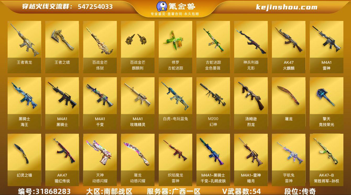 广西一区-56V-3王者武器数-0炫金武器数 【热门武器】:M200-幻神,金色蔷薇-古蛇迷踪,修罗-古蛇迷踪,白虎-电玩蓝兔,M4A1-黑骑士,汤姆逊-烈龙*6,金色蔷薇-空 【王者炫金武器】:王者青龙,王者之啸 【音效卡】:M200-幻神音效卡,炼狱-百战金芒-庆典舞曲音效卡 【皮肤】:幻神-周瑜皮肤,幻神-动感闪耀 皮肤,雷神-暗月*2,雷神-荣耀之魄,雷神-宇航兔皮肤,雷神-炽焰魔龙,M4A1-再燃火线,雷神-神秘按键 皮肤,火麒麟-平天大圣,M4A1-千变-孔明皮肤,战神-粉色甜心皮肤*2,战神-紫绶金章皮肤,AK47-B-常胜将军-曹操,AK47-B-常胜将军-孙权,轻型军用手斧-再燃火线 【角色】:炫,妮妮,王者-葵-貂蝉,蛇隐宗,乔伊教练,葵-阿尔法武装,初恋灵狐,芳心审判者,嘉年华灵狐,娟娟,零-水下丽影,曼陀罗-X,潜龙队-X,蛇姬,斯沃特-X,铁骑荣耀,兔囡囡,雪莉杨 【人偶武器】:金色蔷薇-空,天龙-乔伊教练,AWM-灵狐-15周年嘉年华,迷你波特博士*2,夺魂,迷你生化手雷,生化手雷-机甲核心*3,深渊终结者手雷,迷你超能女侍,灵狐娃娃手雷 【暴走生化】:超级对讲机 【挑战大师】:AK47-冰龙粉碎者,冰龙粉碎者-白马银枪,激光毁灭者III,神圣爆裂者-末日III 【英雄级武器】:M4A1-千变,AK47-火麒麟,M4A1-雷神*2,M4A1-黑骑士,QBZ03-天罚,无影-神兵利器,金色蔷薇-古蛇迷踪,M4A1-玫瑰精灵,AK-47-猩红传说,黑骑士-海王*2,白虎-电玩蓝兔,M200-幻神,炼狱-百战金芒,汤姆逊-烈龙*6,天神-动感闪耀,修罗-古蛇迷踪,屠龙*2,马来剑-夜魔,幻灵之锋,擎天-竞技荣光,屠龙-动感闪耀,麒麟刺-百战金芒,高爆手雷-夜魔,高爆手雷-幻灵,高爆手雷-竞技荣光*4,手雷-动感闪耀,高爆手雷-古蛇迷踪,闪光弹-夜魔,闪光弹-幻灵,闪光弹-竞技荣光*2,烟雾弹-夜魔,烟雾弹-幻灵,烟雾弹-竞技荣光*4,烟雾弹-古蛇迷踪...