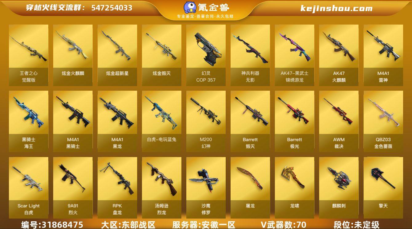 安徽一区-77V-5王者武器数-3炫金武器数 【热门武器】:QBZ03-金色蔷薇,Scar Light-白虎,M200-幻神,死亡之眼*2,白虎-电玩蓝兔,C.A.T,M4A1-黑骑士,汤姆逊-烈龙*6,RPK-盘龙*4,加特林-炼狱*3,雷神-小红,COP 357-幻灵,沙鹰-修罗*4 【王者炫金武器】:炫金火麒麟,炫金超新星,炫金毁灭 【音效卡】:M4A1-黑龙音效卡,M4A1-黑骑士音效卡,Barrett-毁灭音效卡,Barrett-碧霄极光音效卡*5 【皮肤】:幻神-冠军之幻,雷神-星空,雷神-虎将,火麒麟-华夏之心*2,火麒麟-平天大圣*2,火麒麟-巅峰荣耀,火麒麟-心动糖果,毁灭-荣耀之怒,毁灭-战神张飞,毁灭-英雄计划 皮肤,M4A1-千变-孔明皮肤,黑龙-能量核心,M4A1-黑龙-361*2,黑骑士-地狱火,黑骑士-战神马超,AK47-B-常胜将军-孙权 【角色】:零·纪元,王者-魅影,乔伊教练,修道士,初恋灵狐,电竞少女,飞虎队-X,嘉年华灵狐,娟娟,兰-海滩派对,猎狐者-追月,零-水下丽影,灵狐者-黄金海岸,灵狐者-七夕宝贝,龙儿,麻雀,潘多拉-X,潘多拉-甜心教官,邱刚敖,斯沃特-X,兔囡囡,维纳斯,雪莉杨-摸金校尉,职业选手 【人偶武器】:雷神-小红,M4A1-雷神-精英刀锋,AWM-灵狐-15周年嘉年华,C.A.T,迷你牛魔王,迷你牛牛,生化手雷-机甲核心*3,迷你超能女侍,掌上武器-葫芦兄弟 【暴走生化】:死亡之眼*2,超级对讲机 【挑战大师】:冰龙粉碎者-白马银枪*2 【英雄级武器】:AK47-火麒麟,M4A1-黑龙,M4A1-雷神,M4A1-黑骑士,Scar Light-白虎,无影-神兵利器,黑武士-锦绣游龙,QBZ03-金色蔷薇,9A91-烈火,烈火-动感闪耀,王者之心-觉醒版,王者之势-觉醒版,AK-47-猩红传说*2,王者之鲨-觉醒版,黑骑士-海王*2,AK47-B-常胜将军,白虎-电玩蓝兔,Barrett-毁灭*2,Barrett-极光,AWM-裁决,M200-幻神,王者之怒-觉醒版,RPK-盘龙*4,加特林-