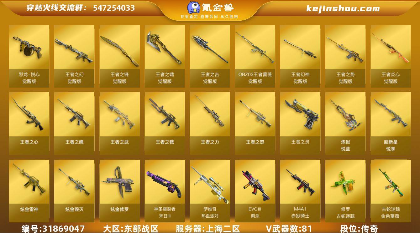 段位:传奇 V武器数:81 王者武器数:21 炫金武器数:4 烈龙-悦心-觉醒版,王者之幻-觉醒版,王者之锋-觉醒版,王者之啸-觉醒版,王者之击-觉醒版,QBZ-03-王者蔷薇-觉醒版,王者幻神-觉醒版,王者之势-觉醒版,王者炎心-觉醒版,王者之心,王者之魄,王者之武,王者之戮,王者之力,王者之怒,王者之灵,炼狱-悦蓝,超新星-悦享 炫金雷神,炫金毁灭,炫金修罗 EVOⅢ-萌杀,神圣爆裂者-末日III,萨维奇-热血派对,M4A1-赤狱骑士,修罗-古蛇迷踪,金色蔷薇-古蛇迷踪,黑武士-CF网剧冠军,天神-CF网剧冠军,无影-神兵利器,擎天-CF网剧冠军,超新星-热带奇洋,龙啸-热带奇洋,USP-小动物,云龙扇,AK47-黑武士-锦绣游龙,AK47-火麒麟,AK47-无影,AK47-黑鲨,AK47-黑武士,AK47-机械迷城,M4A1-雷神,黑骑士-海王,M4A1-黑骑士,M4A1-龙血,M4A1-千变,M200-幻神,Barrett-毁灭,Barrett-极光,AWM-天龙,Kar98k-星神,AA-12-雷霆,AK12-天启,AN94-超新星,HK417-朱雀,QBZ03-金色蔷薇,Scar Light-白虎,9A91-烈火,屠龙,麒麟刺,擎天,USP-雷暴,Barrett-暗月传说,柯尔特-电竞装甲,斩神刀-雷暴,AK47-B-战士,AK47-B-战神,AK-47-猩红传说,裁决,G36C-幻影,天神-动感闪耀,屠龙-动感闪耀 王者-零-传说之路,王者-魅影,王者-瞳-闭月羞花,王者雨墨 炽天使,葵,零·纪元,岚兮儿,迷迭香,瞳,战地猎狐,职业选手 星神-古蛇迷踪音效卡,M4A1-黑骑士音效卡,Barrett-毁灭音效卡,M4A1-雷神音效卡