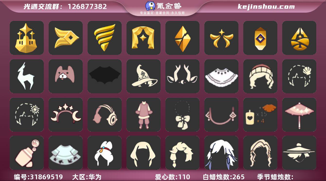 VIVO 手机账号 3珍稀物品 10毕业季 6毕业图 113蜡烛 【珍稀物品】白枭(帝企鹅发),透明蝶翼斗,彩虹围巾(五塑彩带斗) 【季节已毕业】潜海季,表演季,破晓季,欧若拉季(欧若拉),追忆季,归巢季,九色鹿(九色鹿季),二重奏季,姆明季,彩染季 【完成地图】晨岛,云野,雨林,霞谷,墓土(暮土),禁阁 【礼包】青衫落拓礼包,线框斗篷礼包(周年线框斗篷),爱心眼镜,水母(水母肩饰),姆明饰品套装(姆明尾巴),奔跑发型(奔离远行发),海蓝波浪发型(海洋发型),南瓜(冥龙南瓜),绊爱(绊爱斗篷)(绊爱礼包),橘子(大橘大利),雪花(雪花发夹),贝壳(贝壳发饰),兔子(玉兔头饰)(玉兔发饰)(兔子发饰),四叶草(四叶草头饰),星月头饰(星月头冠),九色鹿角(神鹿祝福头饰)(神鹿祝福礼包),新年耳钉(金鳞耳饰),彩虹耳机,创始人(创始人斗篷),吉他(音韵吉他)(白吉他),小提琴(凯旋提琴),献瑞折扇礼包,秋千(情人秋千),大铁头,小狗周年发饰(小狗周年头饰) 【裤子】青鸟尊贵蓬头裤子(蓝色燕尾服),飞天裤(柔缎花边连)(九色鹿丝带裤),妮妮裙子(妮妮长裙),蓝绿裤(高领舞服),武士裤,背带裤,搓澡巾,击剑裤 【面具】呼吸面具(潜水面具),黄眉企鹅面具,辉光羚羊面具 【面饰】红耳机 【项链】围巾(肩带) 【发型】小王子发型,单侧绑发(单边小辫),海蓝波浪发型,飞天盘发(九色鹿丸子头),留辫蘑菇头,虚荣,归巢毕业发型(五塑彩羽发),若笠(箬笠) 【头饰】平顶帽,蓝色音乐会(蓝色音乐符) 【斗篷】冥龙斗篷,燕尾斗篷,遥鲲斗篷(双翼遥鲲斗),彩染围巾斗篷,绿芽,海洋斗 【配饰】鲲灯(追忆之书),小红伞(姆明红伞)(姆明大伞),姆明抱枕,二重奏挂画(合奏挂画),雨伞,高音钢琴(白色高脚钢琴)