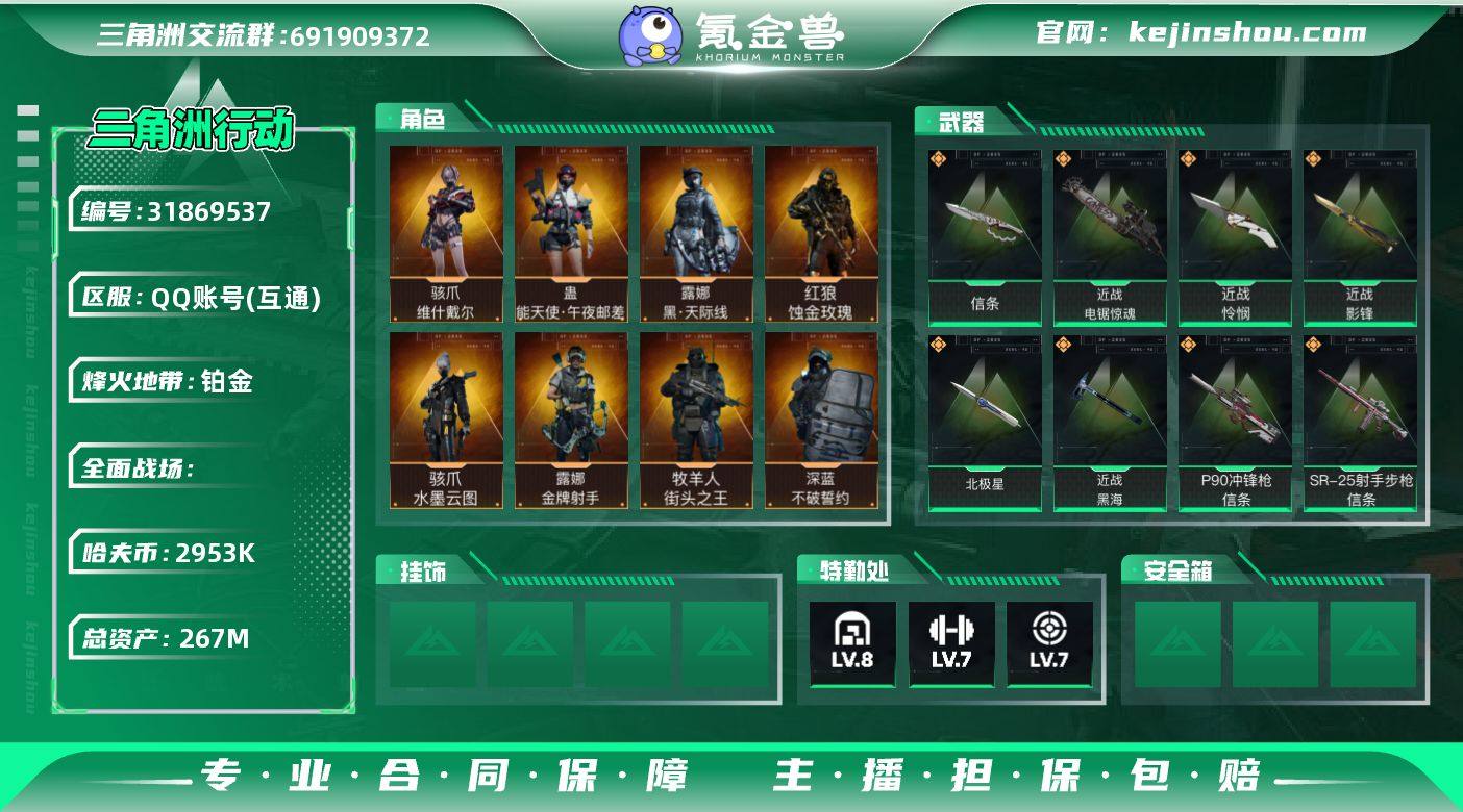 "YXB-满体满负-2953k哈伏币-总资产267m流动资产201m-60烽火等级-铂金-45战场等级-上等兵 部门33333特勤处仓库8训练中心7靶场7 【干员外观】:红狼-蚀金玫瑰,骇爪-水墨云图,露娜-黑·天际线,蛊-能天使午夜邮差,骇爪-维什戴尔,威龙-铁面判官,威龙-壮志凌云,威龙-飞虎,蜂医-送葬人·无题密令,牧羊人-街头之王,无名-夜鹰,深蓝-不破誓约,红狼-电锯惊魂,露娜-金牌射手 【近战皮肤】:近战-北极星,近战-信条,近战-黑海,近战-影锋,近战-怜悯,近战-电锯惊魂,近战-黑鹰 【传说外观】:M4A1突击步枪-蚀金玫瑰,M4A1突击步枪-阿米娅,AKM突击步枪-动力风潮,QBZ95-1突击步枪-破军,ASh-12战斗步枪-怜悯,ASh-12战斗步枪-哈夫克工业,ASh-12战斗步枪-鹅鸭杀,K416突击步枪-尖峰行动,K416突击步枪-白鹰军团,AUG突击步枪-尖峰行动,M7战斗步枪-白玫瑰,M7战斗步枪-怜悯,M7战斗步枪-维京,SG552突击步枪-白鹰军团,SG552突击步枪-运动员,AK-12突击步枪-夜鹰,AK-12突击步枪-特斯拉线圈,SCAR-H战斗步枪-地下交易,SCAR-H战斗步枪-铁艺苍穹,SCAR-H战斗步枪-水墨云图,SCAR-H战斗步枪-启航,G3战斗步枪-骑士,CAR-15突击步枪-黑鹰坠落,CAR-15突击步枪-阿米娅,AS Val突击步枪-地下交易,腾龙突击步枪-捞点薯条,K437突击步枪-北极星,P90冲锋枪-神秘艺术,P90冲锋枪-信条,Vector冲锋枪-黑暗力量,Vector冲锋枪-能天使-午夜邮差,UZI冲锋枪-特斯拉线圈,SMG-45冲锋枪-骑士,SR-3M紧凑突击步枪-特斯拉线圈,勇士冲锋枪-能天使-午夜邮差,QCQ171冲锋枪-北极星,QCQ171冲锋枪-鹅鸭杀,M1014霰弹枪-影锋,S12K霰弹枪-电锯惊魂,725双管霰弹枪-送葬人-无题密令,M249轻机枪-赤枭,M250通用机枪-骑士之心,QJB201轻机枪-鹅鸭杀,M14射手步枪-电锯惊魂,SR-25射手步枪-水墨云图,SR-25射手步枪-信条,PSG-1射手...