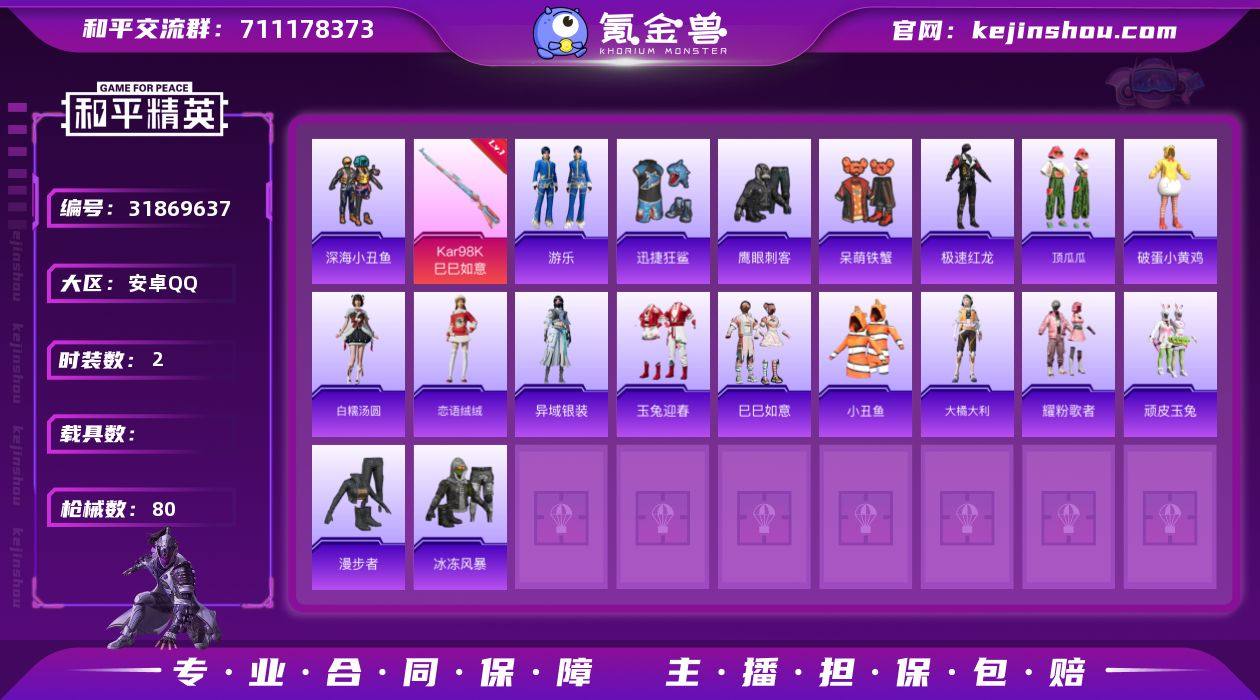 M1046579【身法号2粉装-2特效枪 深海小丑鱼,小丑鱼】安卓手Q-2粉装-2特效枪-74套装-80枪皮-1王牌印记-不朽星钻Ⅱ-22440热力值【2粉装】角色-荧海星豚,角色-异瞳寒姬【2特效枪】Kar98K-巳巳如意[5级],DP-28-豹影疾电[5级]【2稀有】深海小丑鱼,小丑鱼【5飞行器】鸡智如我飞行器,炫彩糖果飞行器,异域银装飞行器,破刃行动尾迹,狂鲨锋刃飞行器【1头盔】梦幻火箭头盔【148其它衣服和枪皮】薄荷星砂,秘语星愿,极速红龙,SS32特训,角色-绯色魅影,海岛探路者,灼焰舞者,街头潮人,迅捷狂鲨,顽皮玉兔,红色运动,角色-紫俏灵猫,大橘大利,耀粉歌者,魅力单车,蜜露汐语,SS34特训,鹰眼刺客,呆萌铁蟹,冷焰舞者,元气之梦,湖蓝色名流,青年教官,战术大师,缤纷果语,恋语绒绒,SS37特训,破蛋小黄鸡,玩偶服-懒羊羊,橘黑制服,午间小调,特训学院,白糯汤圆,玉兔迎春,粉黛兰香,萌鸡速递,长空猛禽,狙击之神,异域银装,凌霄紫焰,竞技名士,擎苍青焰,特战装甲,蓝彩潮人,风迹短诗,朱霞炽焰,暗金炫舞,元素星魂,SS31特训,炫彩糖果,云魄琉璃,冰冻风暴,绮丽涂鸦,黑色伏地魔,SS33特训,巳巳如意,顶瓜瓜,SS36特训,战地督导,猛禽,漫步者,幻影武者,疯狂小兔子,柠萌假日,游乐,漫游都市,雪国风尚,人气偶像,竞技达人朋克,SS35特训,UZI-炫彩糖果,AKM-涂鸦街区,MG-36-薄荷星砂,破片手榴弹-拽到爆炸,莫辛纳甘-风迹短诗,烟雾弹-冰氧夏日,M249-彩虹符号,平底锅-凌霄紫焰,信号枪-异瞳寒姬,GROZA-紫矿核心,M762-天降萌叽,Famas-霓彩脉冲,破片手榴弹-海盐豹豹,20-H-狂鲨锋刃,M24-天降萌叽,AWM-天降萌叽,G36C-星穹咏叹调,M417-玩趣呆呆,S12K-夜灯,S1897-糯团青竹,Mk47-风迹短诗,Mini14-鸡智如我,ARX-凌霄紫焰,AUG-冰晶雪宝,UZI-影袭,Kar98K-影袭,AKS-74U-鸡智如我,电击枪-喜羊羊与灰太狼,SLR-霓彩脉冲,铝热弹-炫彩糖果,蜜獾-风迹短