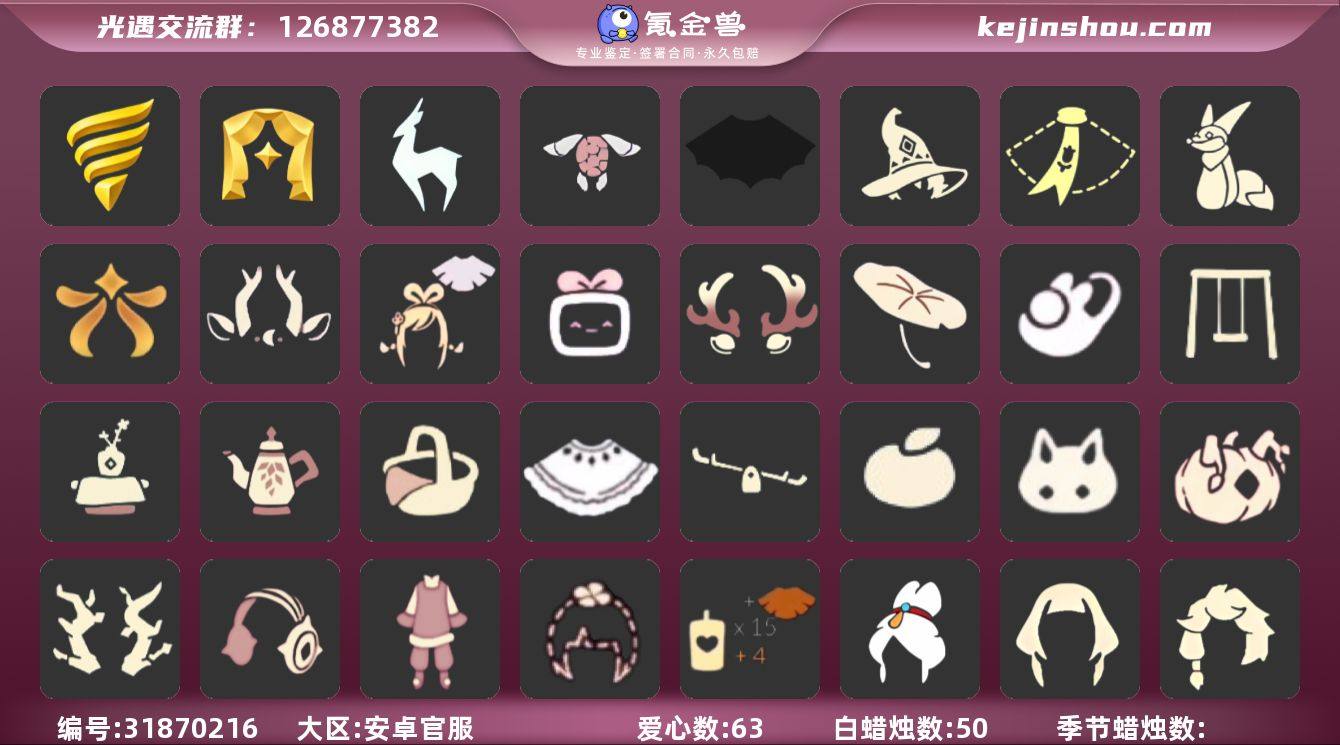 账号类型: 邮箱账号 季节已毕业: 潜海季,表演季,九色鹿季 完成地图: 晨岛,雨林,霞谷,暮土 珍稀物品: 白枭 礼包: 蝙蝠套,巫师,围巾,小狐狸,欧若拉之翼,九色鹿角,绊爱,大铁头,鹿角,荷叶伞,兔子鞋,秋千,茶桌,茶壶,餐桌,白绒金,跷跷板,橘子,兔子,南瓜,枯角,彩虹耳机,新年裤,四叶草,创始人,海龟斗篷 裤子: 武士裤,背带裤,搓澡巾,飞天裤 面具: 呼吸面具,黄眉企鹅面具 面饰: 红耳机 发型: 若笠,虚荣,单侧绑发,留辫蘑菇头,飞天盘发 头饰: 蓝色音乐会 斗篷: 海洋斗,绿芽,燕尾斗篷 配饰: 雨伞,高音钢琴,蓝色手碟 亮点: 【优质装备】:表演季,白枭(帝企鹅发),武士裤,潜海季,高音钢琴(白色高脚钢琴),九色鹿(九色鹿季),飞天裤(柔缎花边连)(九色鹿丝带裤),呼吸面具(潜水面具),黄眉企鹅面具,单侧绑发(单边小辫),留辫蘑菇头,燕尾斗篷,蓝色手碟(毕业手碟),飞天盘发(九色鹿丸子头),蝙蝠套(蝙蝠斗篷)(南瓜头),欧若拉之翼,绊爱(绊爱斗篷)(绊爱礼包),秋千(情人秋千),茶桌(花憩茶桌),茶壶(小憩茶桌),餐桌(野餐礼包),跷跷板(情人跷跷板),红耳机,围巾(小王子斗篷)(小王子围巾),九色鹿角(神鹿祝福头饰)(神鹿祝福礼包),大铁头,鹿角(圣诞鹿角),荷叶伞,海龟斗篷,巫师(巫师帽),小狐狸(狐狸背包),白绒金(白雪斗篷),枯角(巫树犄角),彩虹耳机,新年裤(瑞气服饰),晨岛,雨林,霞谷,墓土(暮土),若笠(箬笠),兔子鞋(兔子拖鞋),创始人(创始人斗篷),兔子(玉兔头饰)(玉兔发饰)(兔子发饰),南瓜(冥龙南瓜),橘子(大橘大利),四叶草(四叶草头饰)