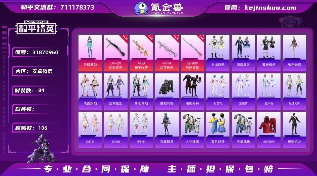 安卓 微信-1粉装-7特效枪-0载具-1粉色飞行器-26534热力值-6王牌印记-84套装-106枪皮 【热门品类】:套装-暗影哥特 【粉色套装】:角色-异瞳寒姬 【粉色枪皮等级】:AUG-暖羊咩咩(五级),ACE32-萌骑漫游(四级),AKS-74U-森灵之息(五级),Kar98K-巳巳如意(四级),Mk14-甜梦熊击(五级),Mk14-福马献瑞(五级),DP-28-豹影疾电(五级) 【粉色枪皮】:AUG-暖羊咩咩,ACE32-萌骑漫游,AKS-74U-森灵之息,Kar98K-巳巳如意,Mk14-甜梦熊击,Mk14-福马献瑞,DP-28-豹影疾电 【粉色飞行器】:炫彩糖果飞行器 【粉色降落伞】:幻影战神降落伞,星之彼岸降落伞,绯穹魔姬降落伞,无垠阁降落伞,炫彩糖果降落伞 【稀有套装】:套装-雪国风尚,套装-炫彩糖果,套装-马上有钱,套装-粉恋花,套装-紫幽梦,套装-蓝冰羽,套装-极速光影,套装-彩虹兔,套装-云朵鹅,套装-雪绒豹,角色-夜瞳黯灵,套装-朱霞炽焰,套装-凌霄紫焰,套装-擎苍青焰,角色-绯色魅影,套装-书海巡游,套装-画境星梦,套装-琴音绮想,套装-雨过天青,套装-红釉青花 【稀有枪皮】:AUG-冰晶雪宝,AKM-星之彼岸,AKM-龙的传人,M16A4-蓝色火焰,SCAR-L-夜灯,M416-蓝色火焰,GROZA-影袭,AUG-幻影战神,AUG-耀粉歌者,AUG-绝对恒星,M762-彩虹符号,M762-云朵鹅,ACE32-画境星梦,ARX-凌霄紫焰,UZI-啾咪啾咪,UZI-天降萌叽,UZI-影袭,UMP45-夜灯,UMP45-生命誓言,汤姆逊-幻影战神,汤姆逊-环太平洋,MP5K-画境星梦,JS9-凌霄紫焰,M24-影袭,Mini14-穿刺龙虾,SVD-云朵鹅,M1加兰德-画境星梦,S686-生命誓言,S12K-夜灯,S12K-极意拳锋,DBS-彩虹符号,AA12-G-画境星梦,SPAS-12-云朵鹅,M249-绯穹魔姬,MG3-智耀战神,MG-36-凌霄紫焰,P92-凌霄紫焰,沙漠之鹰-云朵鹅,大砍刀-云朵鹅,平底锅-凌霄紫焰,平底锅-画境星梦 【其他套装】:套装-人气偶像,套装-...