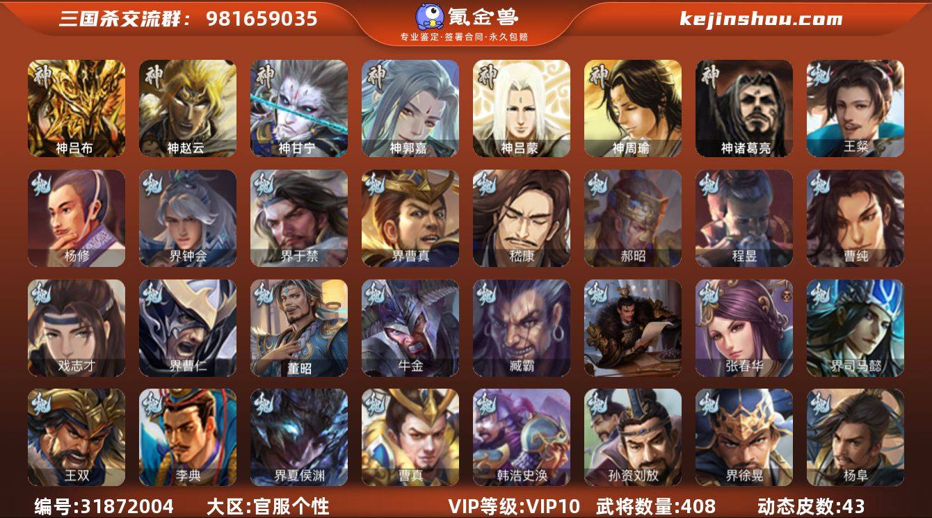【3923】官阶:大将军;VIP等级:VIP10;史诗武将数量:45;动态皮肤数量:43;武将总数:408;史诗宝珠数量:0;将魂数量:4753;神将:5;魏国史诗武将:20;蜀国史诗武将:12;吴国史诗武将:8;群史诗武将:11 神吕布,神赵云,神甘宁,神郭嘉,神诸葛亮,王粲,杨修,界钟会,界于禁,界曹真,嵇康,郝昭,曹纯,戏志才,程昱,马云騄,谋赵云,谋马超,诸葛瞻,周群,赵襄,张星彩,沙摩柯,谯周,界黄忠,花鬘,董允,周处,吴景,骆统,留赞,界朱然,界徐盛,界步练师,贺齐,左慈,星黄忠,苏飞,麹义,沮授,界左慈,界李儒,公孙康,杜预,许攸,兀突骨,神吕蒙,神周瑜,SP关羽,SP曹仁,SP蔡文姬,乐进,曹昂,诸葛诞,朱灵,文聘,SP姜维,张春华,钟会,曹冲,郭淮,满宠,界王异,界曹操,界司马懿,界夏侯惇,界张辽,界许褚,界郭嘉,李典,曹真,韩浩史涣,陈群,曹叡,曹休,钟繇,司马朗,王基,李通,郭皇后,孙资刘放,辛宪英,界甄姬,吕虔,鲁芝,蒯越蒯良,界典韦,界荀彧,界徐晃,杜畿,界曹丕,毌丘俭,界邓艾,张恭,界曹植,界曹彰,界满宠,界郭淮,卞夫人,华歆,蔡贞姬,袁涣,王双,崔琰,毛玠,杨阜,阮慧,谋徐晃,谋于禁,界曹休,牛金,界夏侯渊,界曹仁,臧霸,唐咨,董昭,SP孙尚香,关银屏,夏侯霸,马良,关兴张苞,廖化,界马岱,关平,简雍,刘封,界法正,界关兴张苞,界刘备,界关羽,界张飞,界赵云,界马超,SP徐庶,吴懿,周仓,张松,刘谌,夏侯氏,糜竺,马忠,孙乾,李严,黄皓,吴苋,秦宓,界黄月英,界诸葛亮,赵统赵广,严颜,界伊籍,界卧龙诸葛,界庞统,界孟获,界祝融,陈到,界姜维,界刘禅,胡金定,吕凯,张翼,杨仪,界廖化,邓芝,傅肜,陈震,费祎,糜夫人,王甫赵累,界周仓,许靖,向宠,宗预,刘巴,谋庞统,界张嶷,谋张飞,吴班,诸葛果,界魏延,蒋琬费祎,糜芳傅士仁,甘夫人,鲁肃,孙茹,凌操,大乔小乔,诸葛恪,诸葛瑾,孙鲁育,程普,韩当,潘璋马忠,虞翻,朱然,界周泰,界甘宁,界吕蒙,界黄盖,界周瑜,界大乔,界陆逊,孙鲁班,朱桓,顾雍,孙休,朱治,全琮...
