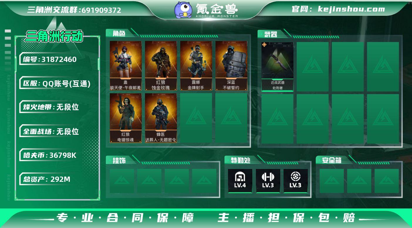 LJ5608总资产291.7M哈弗币36798K近战武器-处刑者红狼蚀金玫瑰,蛊能天使午夜邮差,红狼电锯惊魂,蜂医送葬人无题密令,深蓝不破誓约,露娜金牌射手无无AW子弹35发三角币265仓库LV.7基础安全箱靶场LV.5训练中心LV.7无,红狼-蚀金玫瑰,蛊-能天使午夜邮差,红狼-电锯惊魂,蜂医-送葬人·无题密令,深蓝-不破誓约,露娜-金牌射手,近战-处刑者