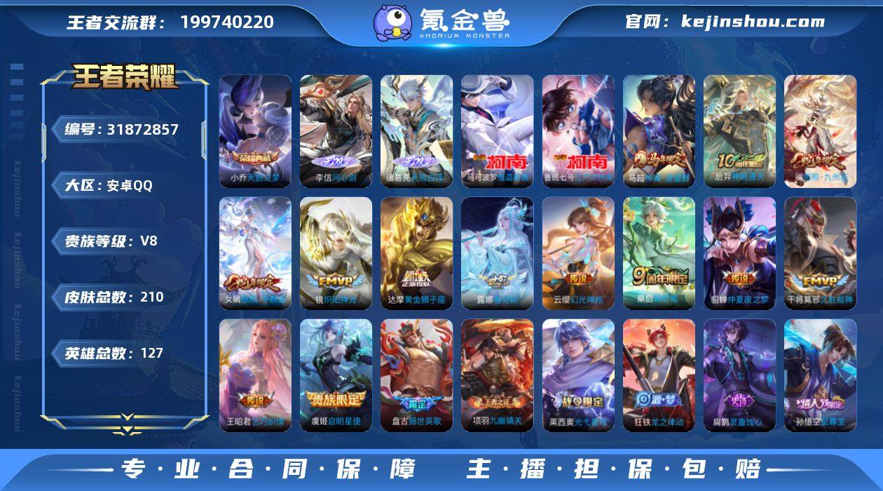 【王者荣耀】珍品无双0 典藏1 无双2 珍品传说3 传说15 史诗71 英雄127 皮肤210 贵族8级 荣耀典藏:天鹅之梦__无双皮肤:天机白泽|问心剑__珍品传说:江户川柯南|怪盗基德|孙策-时之奇旅__传说皮肤:鸣野蒿|炽阳神光|启明星使|仲夏夜之梦|久胜战神|黄金狮子座|狄仁杰-超时空战士|乞巧织情|马超-琥珀纪元|霜月吟|幻光神枪|愿照·九州拓|愿照·千秋盛|神树通天|神骥·逐星野__稀有限定:至尊宝|梁祝|拒霜思|百解令|百里守约-真我赫兹|地狱燃心|古海寻踪|海滩派对|皇家上将|剑破天穹|江河有灵|决胜骁骑|黎明之约|魔术师|青焰无极|燃音魔法|荣光圣徽|探海日志|天穹祈灯|妄想食味|五谷丰年|纤云弄巧|阴阳师|云间偶戏|暗隐猎兽者|冰冠公主|冰雪圆舞曲|乘风破浪|德古拉伯爵|地狱岩魂|伽罗-琥珀纪元|功夫厨神|鬼剑武藏|箭羽风息|金属风暴|乐园奇幻夜|李元芳-蔬乡物语|魅力维加斯|梦奇-顽趣|女仆咖啡|偶像歌手|绅士熊喵|圣诞恋歌|鲁班七号-蔬乡物语|水果甜心|水晶猎龙者|天才门将|天秀·启明|天秀·音浪|星夜王子|鹰眼统帅|幽灵船长|月团寄思|逐浪之夏|紫霞仙子|百里守约-百相守梦|老夫子-百相守梦|谪仙醉月|噬灭天穹|炽弈燎原|撼地雄心|破空之剑|蔡文姬-夏日便利店|虞姬-夏日便利店|天穹之誓|浮光幕影|曙光守护者|特工魅影|心灵骇客|茶境仙|星界战将|器灵·浮梦炉|朔望之晖|孙悟空-神迹守卫|流音漫舞|访茗客|暖冬·兔眠|灵卜魔法|苍威无极|刘禅-鸭鸭历险记|沈梦溪-鸭鸭历险记|灵蛊蚀心|龙之律动|逆浪荇歌|孙策-百相守梦|周瑜-百相守梦|黄忠-百相守梦|光弋星穹|往忆晖光|百里玄策-罗小黑战记|鹤鸣心笺|九幽镇关|小乔-线条小狗|周瑜-线条小狗|撼世英歌__优质皮肤:尼罗河女神|创世神祝|年年有余|孤猎|午夜歌剧院|激情绿茵|天启骑士|维京掠夺者|绯红之刃|第七人偶|潮流仙人|芝加哥教父|街头旋风|绝影神枪|地府判官|荷鲁斯之眼|三太子|精灵王...