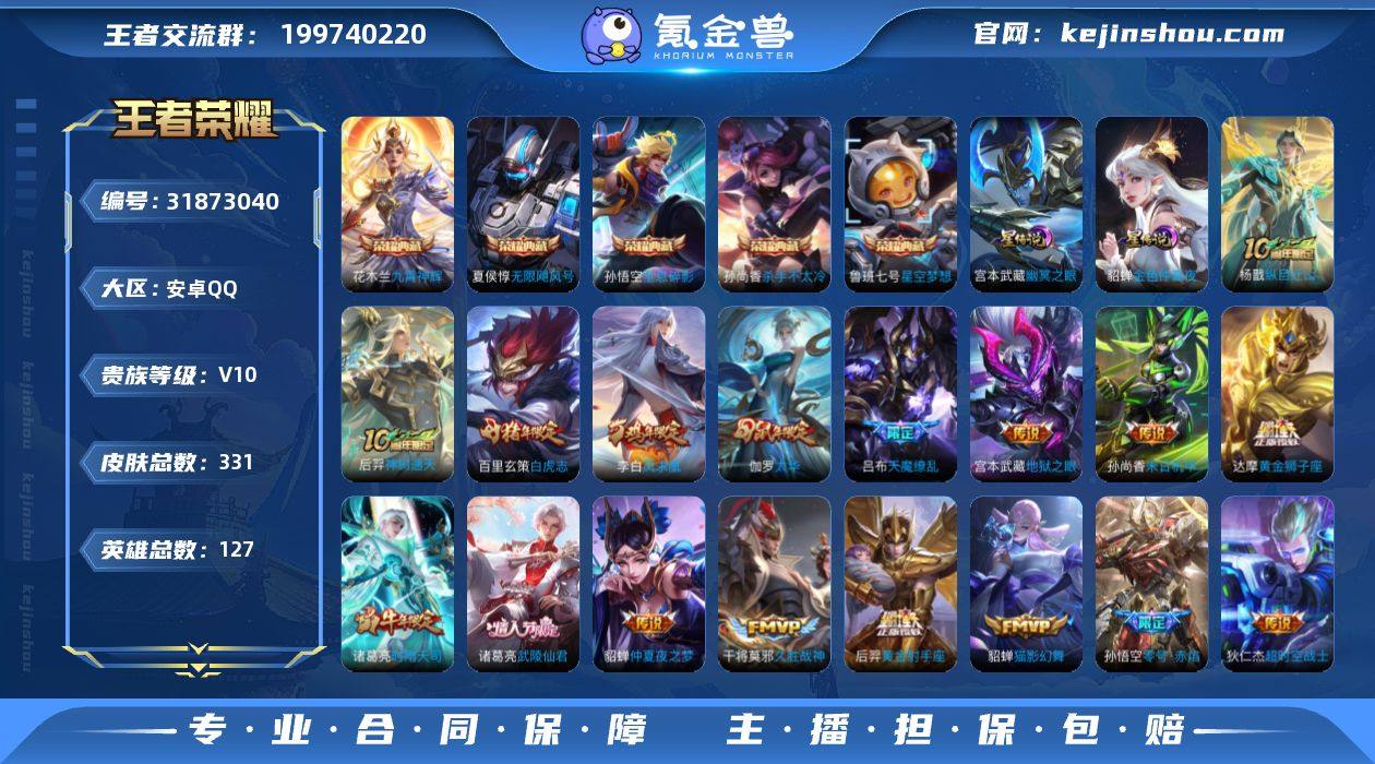 【精品号手慢无】331皮肤-5典藏皮肤-24传说-102史诗 【英雄全皮】:苏烈全皮,影全皮【星元皮肤】:貂蝉金色仲夏夜,宫本武藏幽冥之眼.. 【荣耀典藏】:孙悟空全息碎影,夏侯惇无限飓风号,孙尚香杀手不太冷,鲁班七号星空梦想,花木兰九霄神辉 【传说皮肤】:杨戬纵目迁山,后羿神树通天,艾琳觅芳踪,诸葛亮时雨天司,铠绛天战甲,虞姬启明星使,孙悟空零号赤焰,伽罗太华,貂蝉猫影幻舞,张良黄金白羊座,干将莫邪久胜战神,虞姬云霓雀翎,达摩黄金狮子座,百里玄策白虎志,花木兰冠军飞将,后羿黄金射手座,诸葛亮武陵仙君,貂蝉仲夏夜之梦,李白凤求凰,孙尚香末日机甲,宫本武藏地狱之眼,孙悟空地狱火,吕布天魔缭乱,狄仁杰超时空战士 【限定皮肤】:白起狰,狄仁杰阴阳师,虞姬凯尔特女王,赵云皇家上将,赵云引擎之心,妲己时之彼端,嬴政优雅恋人,嬴政白昼王子,鲁班七号狮舞东方,庄周云端筑梦师,庄周玄嵩,高渐离玩趣恶龙,吕布天魔缭乱,吕布猎兽之王,周瑜赤莲之焰,元歌无心,夏侯惇朔风刀,甄姬幽恒,曹操烛龙,曹操天狼征服者,典韦穷奇,典韦蓝屏警告,典韦岱宗,马可波罗暗影游猎,狄仁杰魔术师,狄仁杰万华元夜,达摩沙漠行僧,项羽海滩派对,老夫子醍醐杖,安琪拉魔法小厨娘,程咬金演武夺筹,韩信飞衡,王昭君凤凰于飞,兰陵王驯魔猎人,花木兰瑞麟志,花木兰默契交锋,孙悟空至尊宝,孙悟空大圣娶亲,孙悟空零号赤焰,牛魔御旌,后羿如梦令,李元芳银河之约,李元芳云中旅人,虞姬霸王别姬,虞姬启明星使,钟馗神迹守卫,钟馗驱傩正仪,女娲朔望之晖,干将莫邪冰霜恋舞曲,蔡文姬繁星吟游,太乙真人饕餮,东皇太一逐梦之光,鬼谷子原初探秘者,诸葛亮武陵仙君,诸葛亮时雨天司,铠青龙志,苏烈玄武志,苏烈千军破阵,百里玄策白虎志,百里守约朱雀志,弈星混沌棋,沈梦溪星空之诺,...